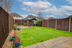 Fence enclosed rear garden, mainly laid to lawn, patio seating area, pathway leading to gated side access.