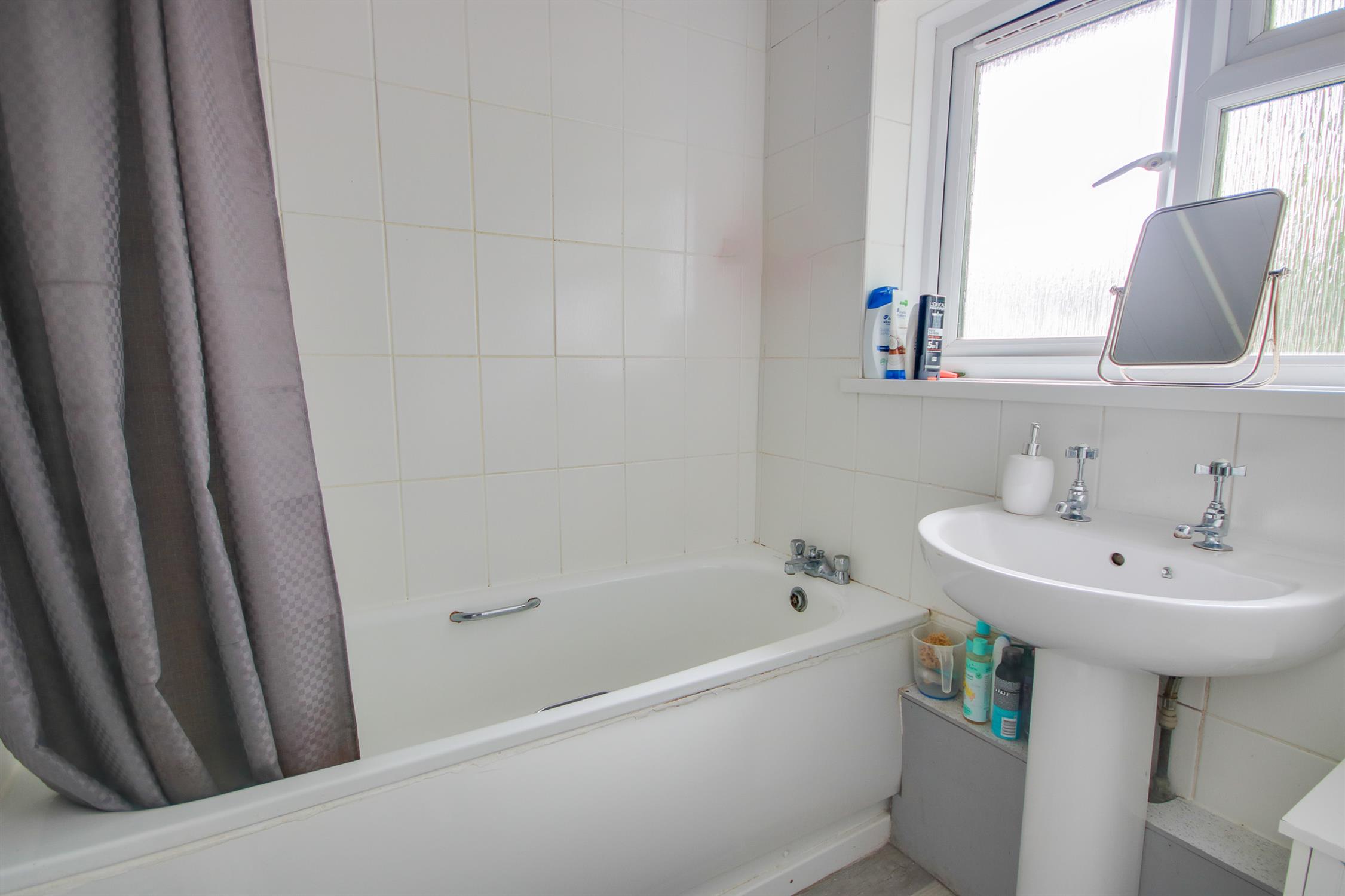 UPVC double glazed obscured window to rear, panel enclosed bath with mains fed shower over, wash hand basin, tiled walls, ladder towel rail, laminate floor.