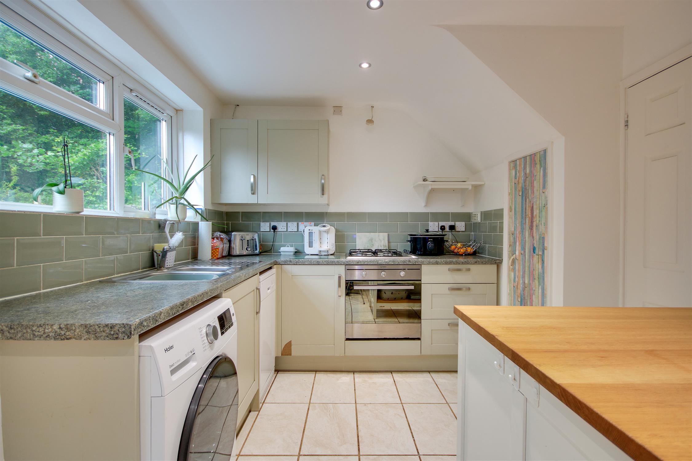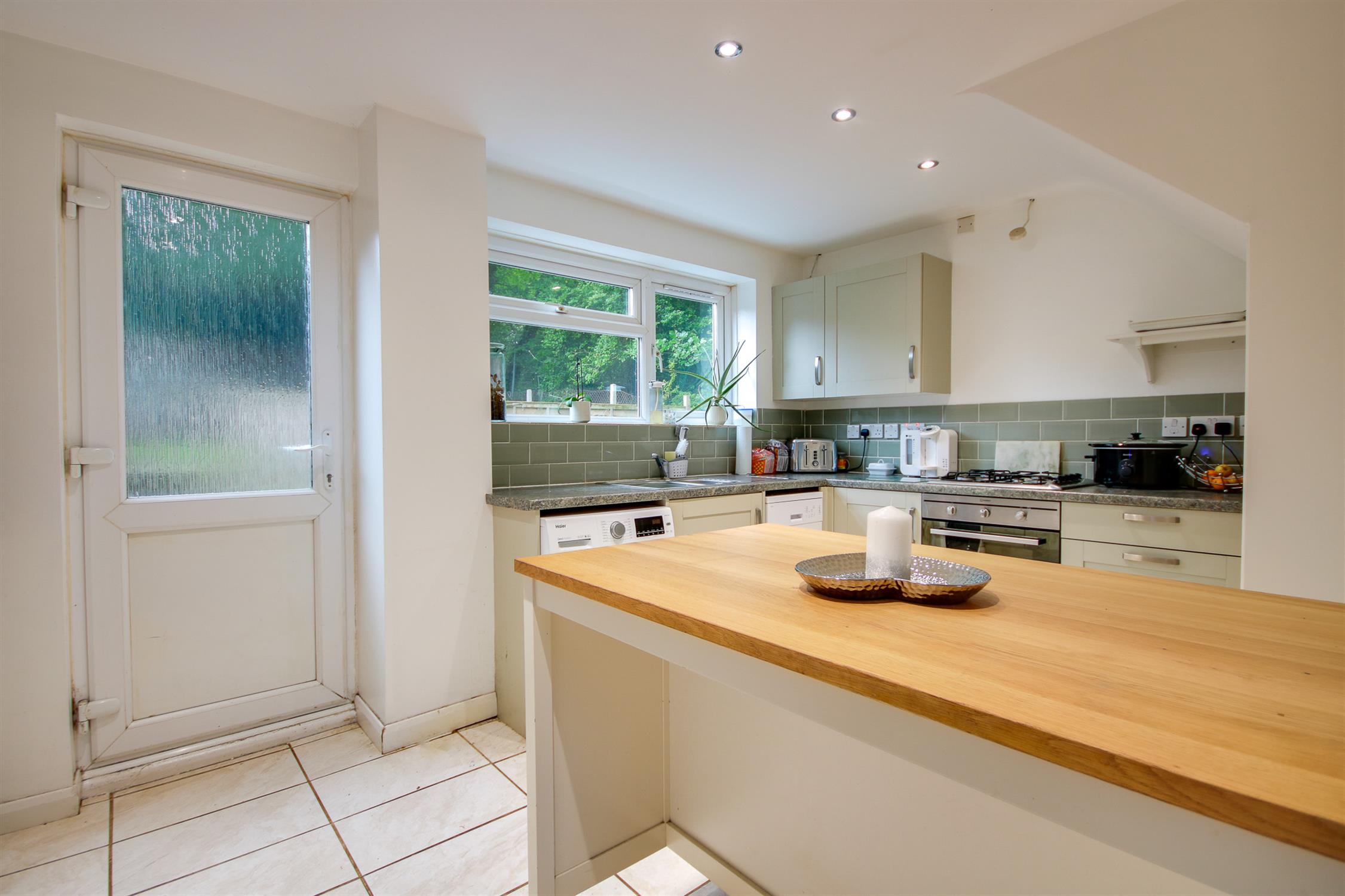 Smooth and coved ceiling with inset spotlights, dual aspect UPVC double glazed window to front and rear, UPVC double glazed door to rear leading to rear garden, wall, base and drawer units with work surface over, stainless steel bowl and a half sink with drainer, built-in oven with gas hob over, space for dishwasher, washing machine, tumble dryer and fridge/freezer, tiled splashbacks, tiled floor, under stairs storage.