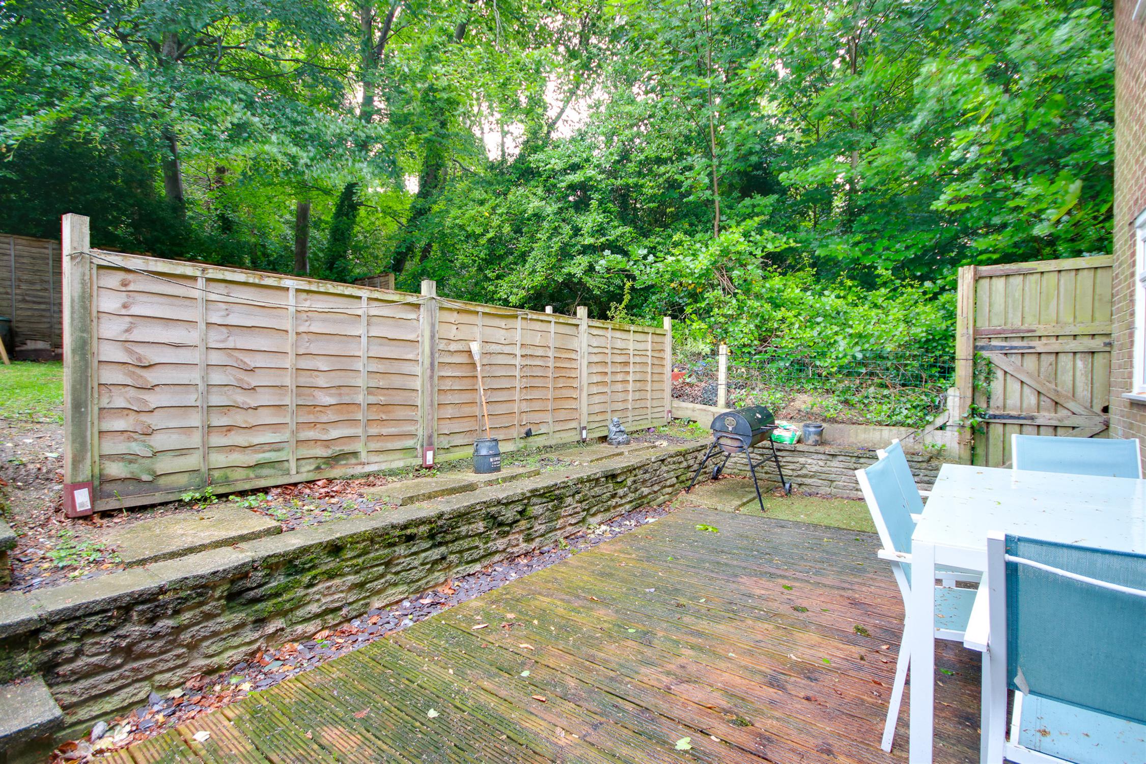 Rear garden siding and bearing onto Woodlands, decked seating area, lawn, patio space.