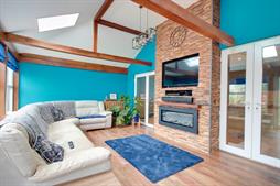 Smooth, vaulted ceiling with two skylights, UPVC double glazed windows and French doors to rear, radiator, electric fire, hard flooring.