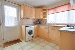 Textured and coved ceiling, double glazed window to front, double glazed door to side, a range of wall, base and drawer units with work surface over, bowl and a half sink and drainer inset, built-in oven and gas hob with extractor over, integral fridge/freezer, space for washing machine, tiled splashbacks.