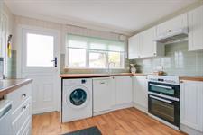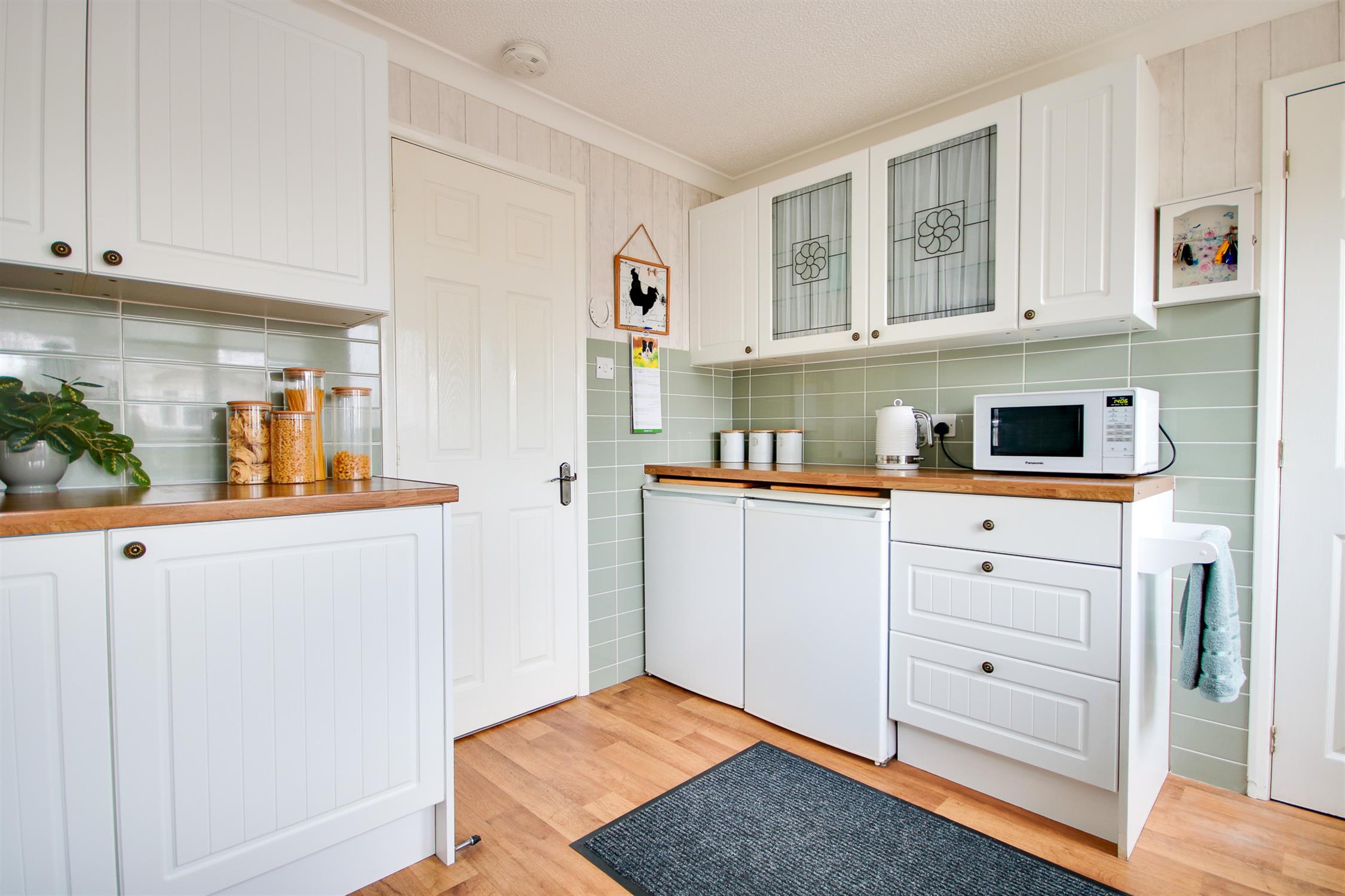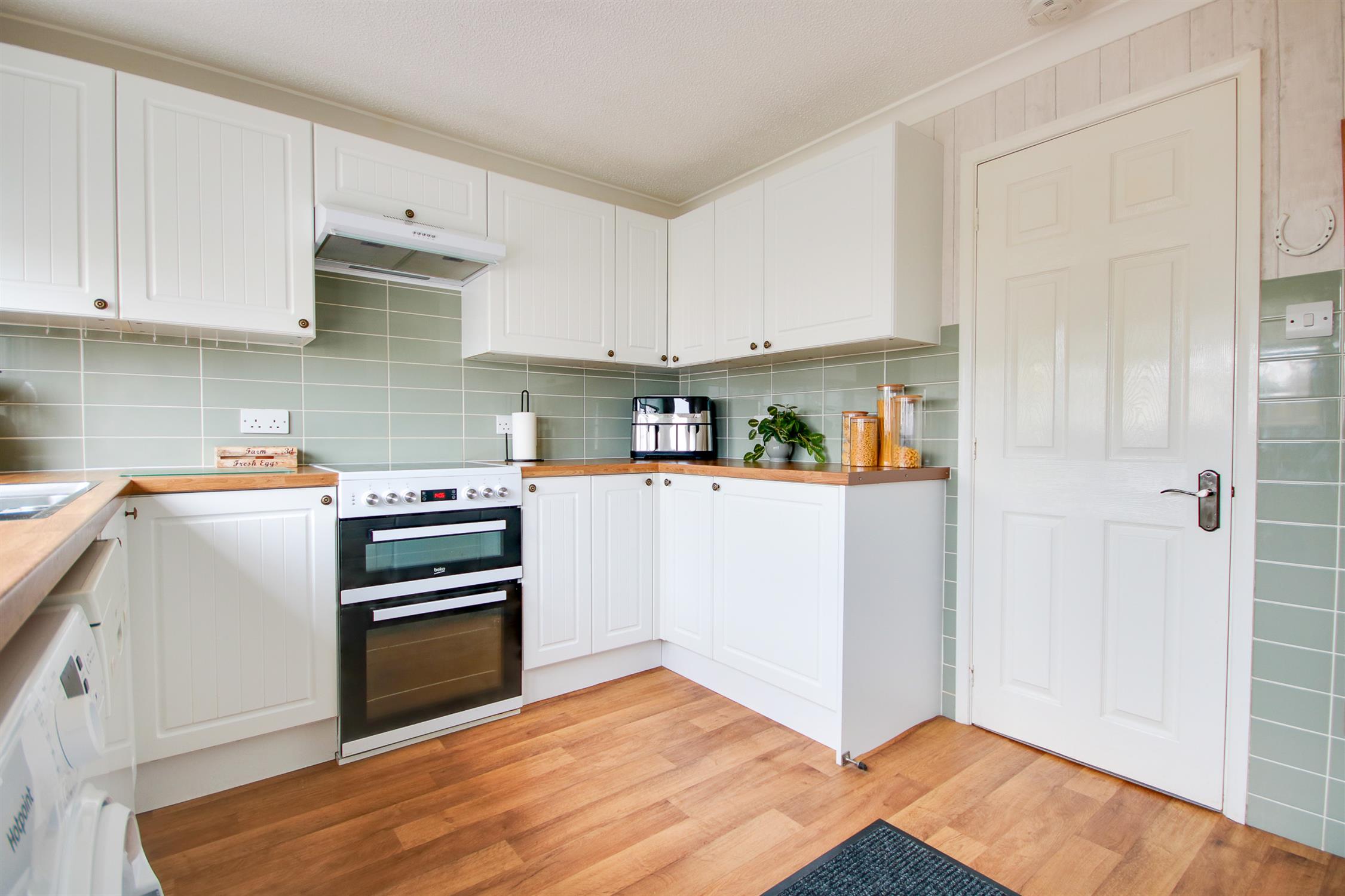 Vinyl laminated wood effect flooring and "metro block" wall tiling in principle areas. "Shaker Style" wall and base units, laminate worktops and under-the-counter space for appliances such as fridge, freezer, slimline dishwasher, oven and washing machine. Over head extractor fan, stainless steel sink with draining board. Fitted storage cupboard currently utilised as a pantry. UPVC double-glazed window to side aspect and textured coved ceiling.