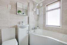 Full wall and floor tiling, underfloor electric heating. Wash hand basin, w/c, curved bathtub with glass screen, mixer taps and wall-mounted electric "Mira" shower. Chrome heated towel rail, UPVC double-glazed window to side aspect and textured coved ceiling.