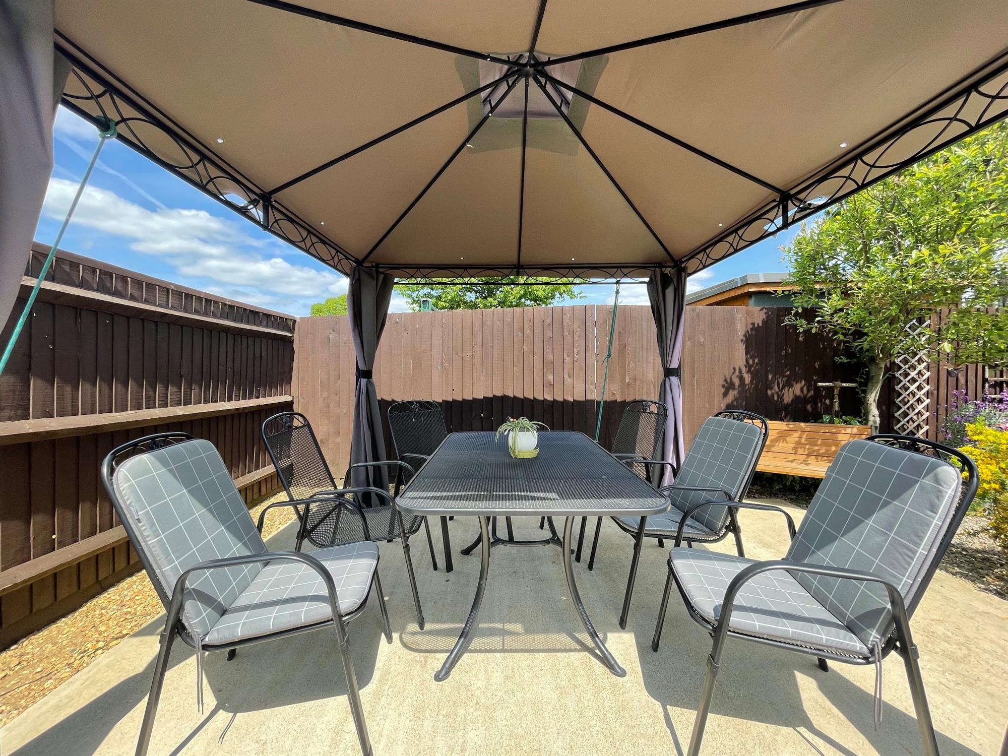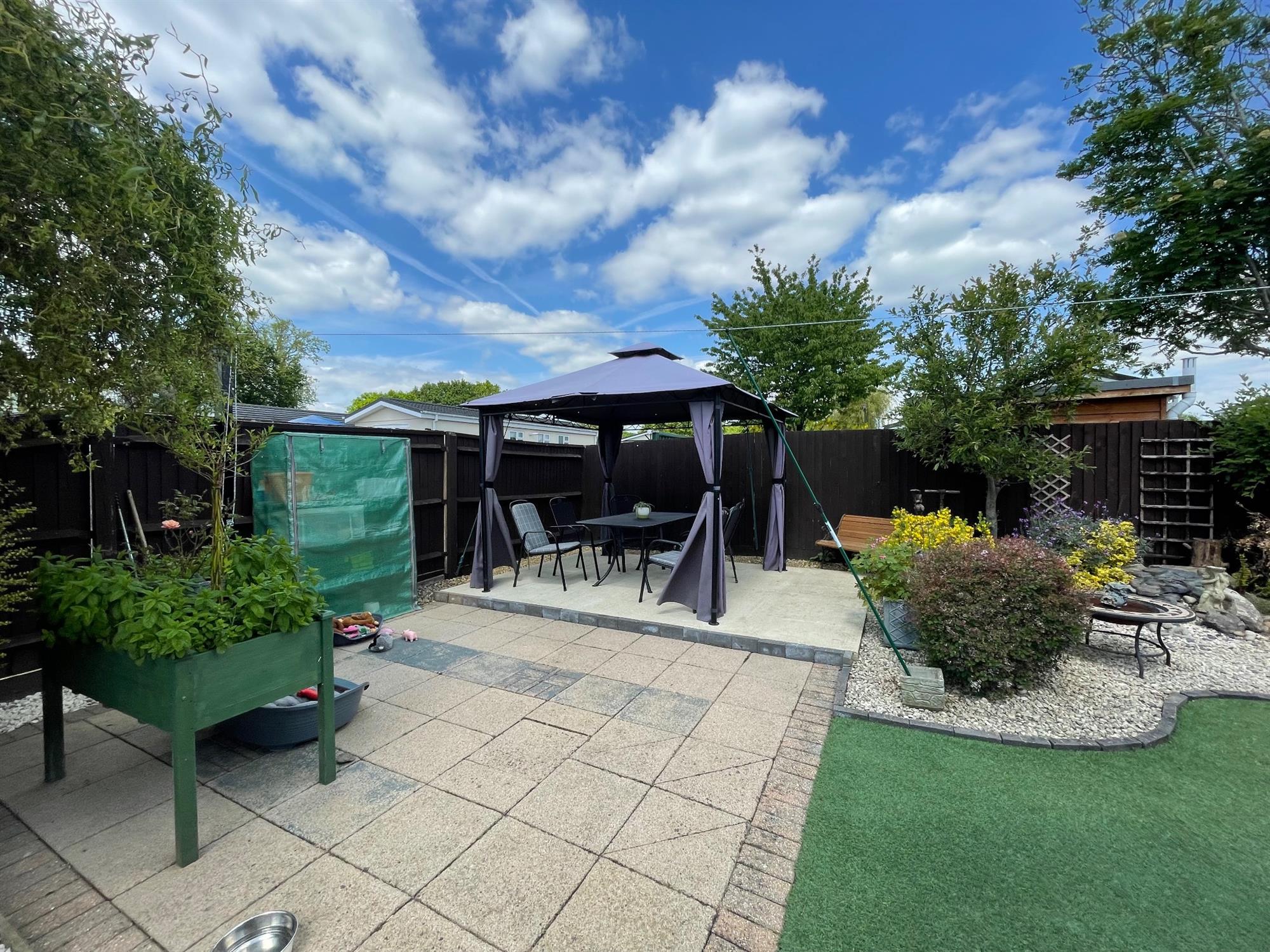 Enclosed fencing with side access. Landscaped patio to artificial lawn, soil borders, external shed with mains fed power source.