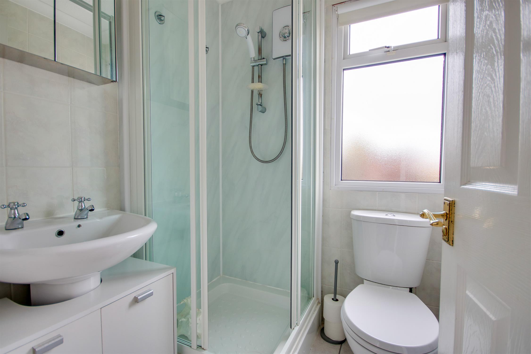 Vinyl flooring and wall tiling, w/c, wash hand basin, cubicle with glass screened doors, tray and electric wall-mounted shower. UPVC double-glazed window to rear aspect and textured coved ceiling.