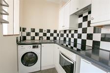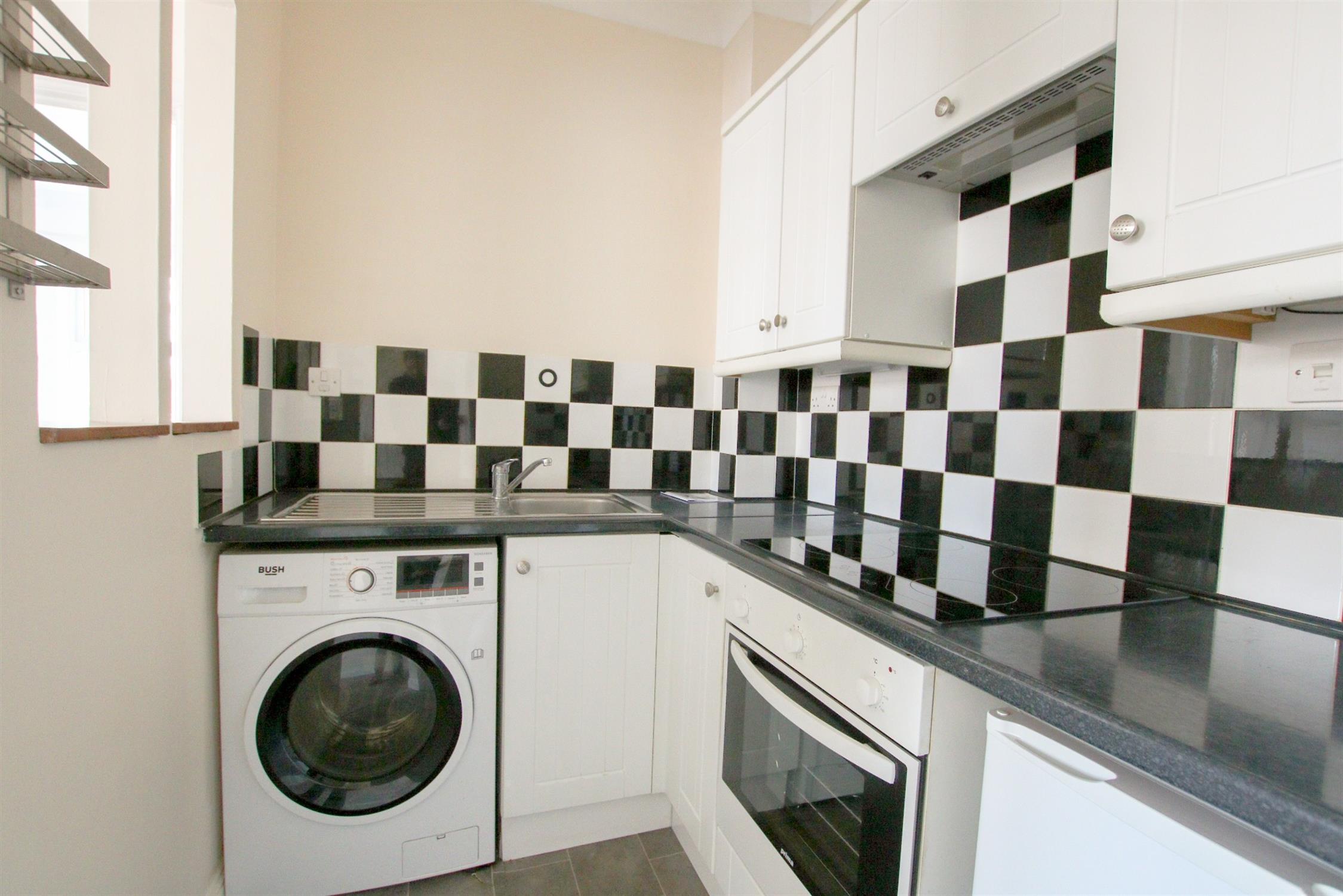Base and eye level units, insert sink to countertop, tiled splash back, integrated electric hob, oven and over hood, space for washing machine and fridge/freezer, textured finish to ceiling with extractor fan
