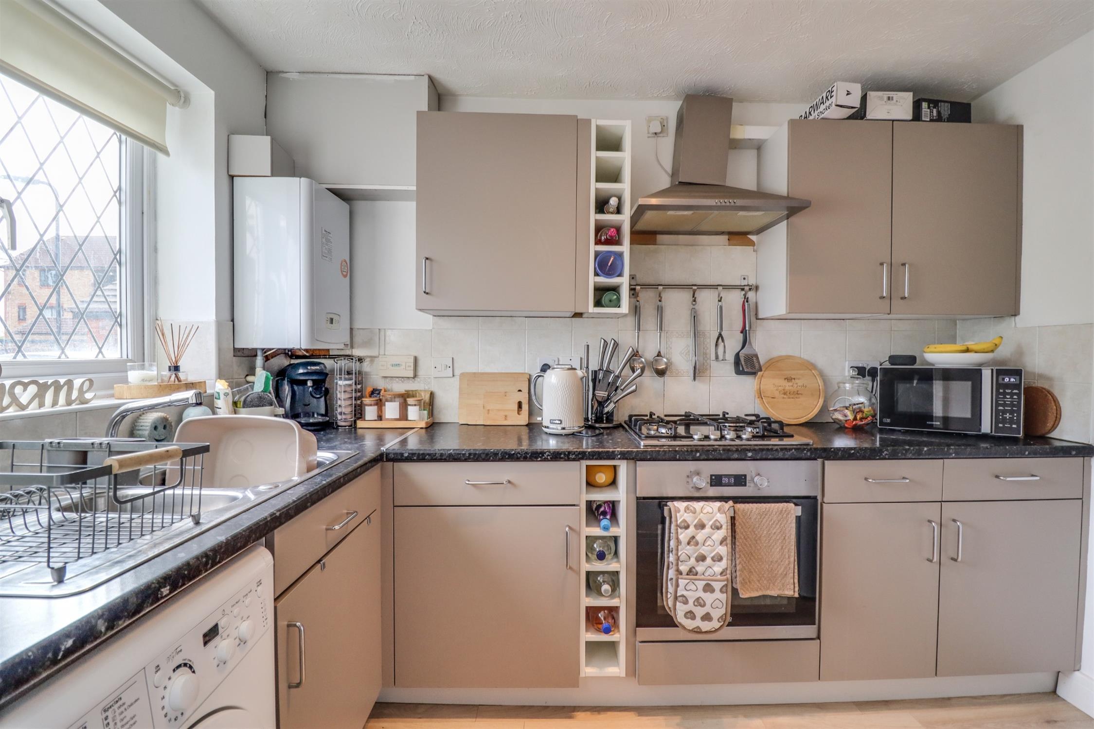 Textured finish to ceiling, double glazed window to front aspect, a range of matching wall and base drawer units with roll top work surface over, one and half sink and drainer inset, built in cooker and hob with extractor over, radiator, tiling in principle areas, space for fridge freezer and washing machine.