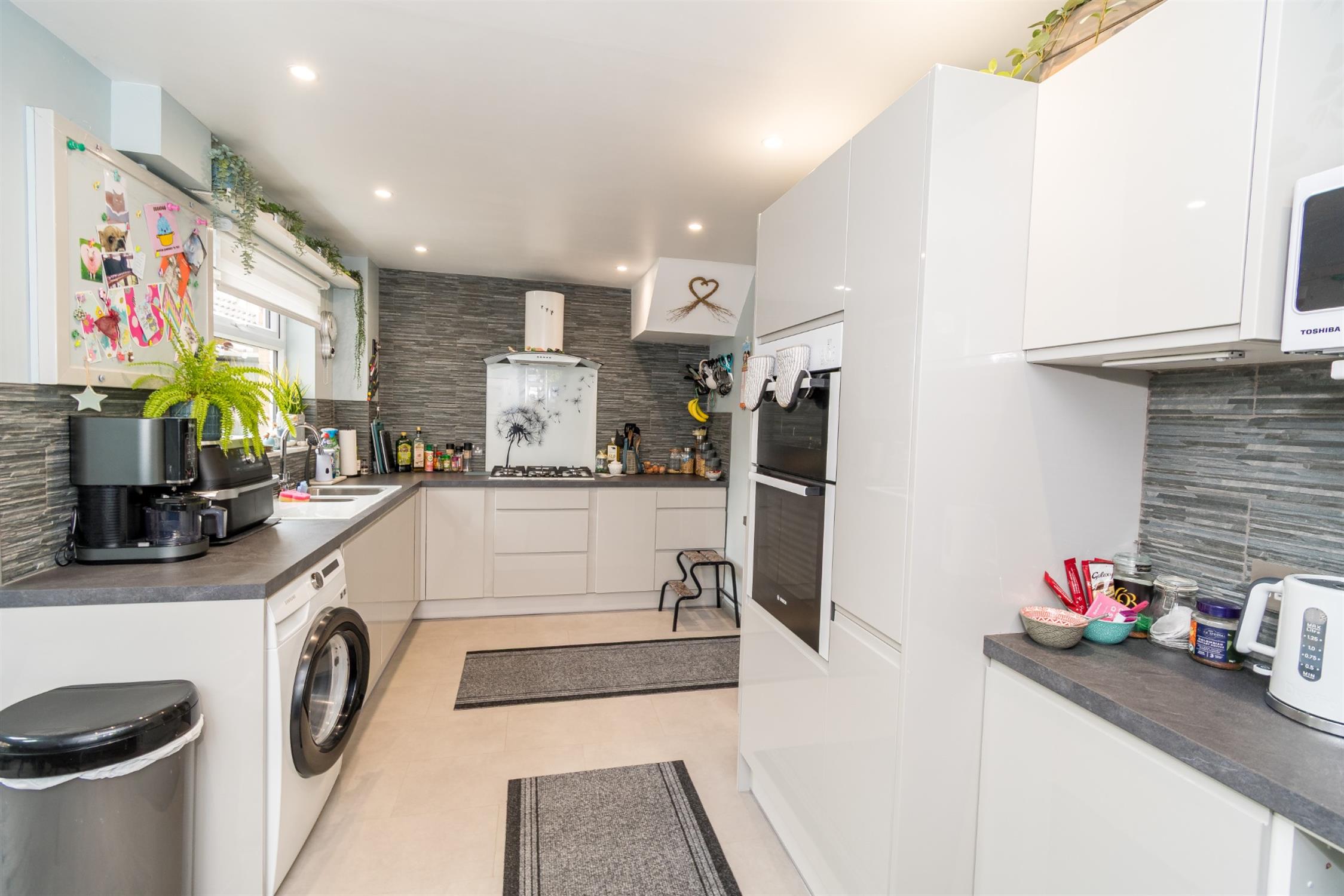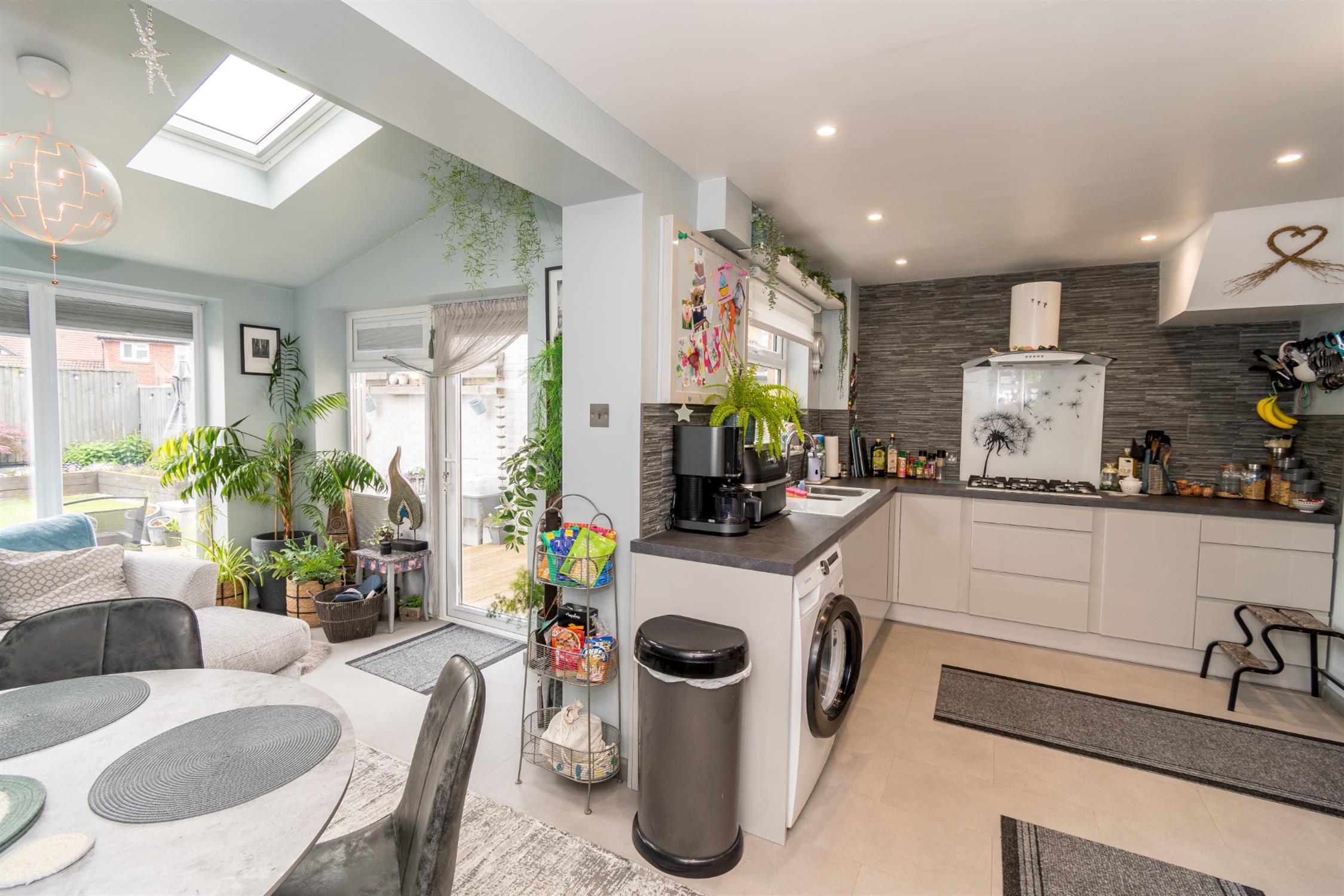 Upon entry, you're welcomed into a hallway leading to a separate lounge boasting a bay window, providing a cosy retreat. The heart of the home lies in the open-plan kitchen, dining, and sitting room. The kitchen benefits ample worktop space, integrated appliances, and abundant storage, catering to culinary enthusiasts. The extended dining and sitting areas, featuring two skylights and large windows with French doors, create a bright and airy space perfect for socialising and entertaining.