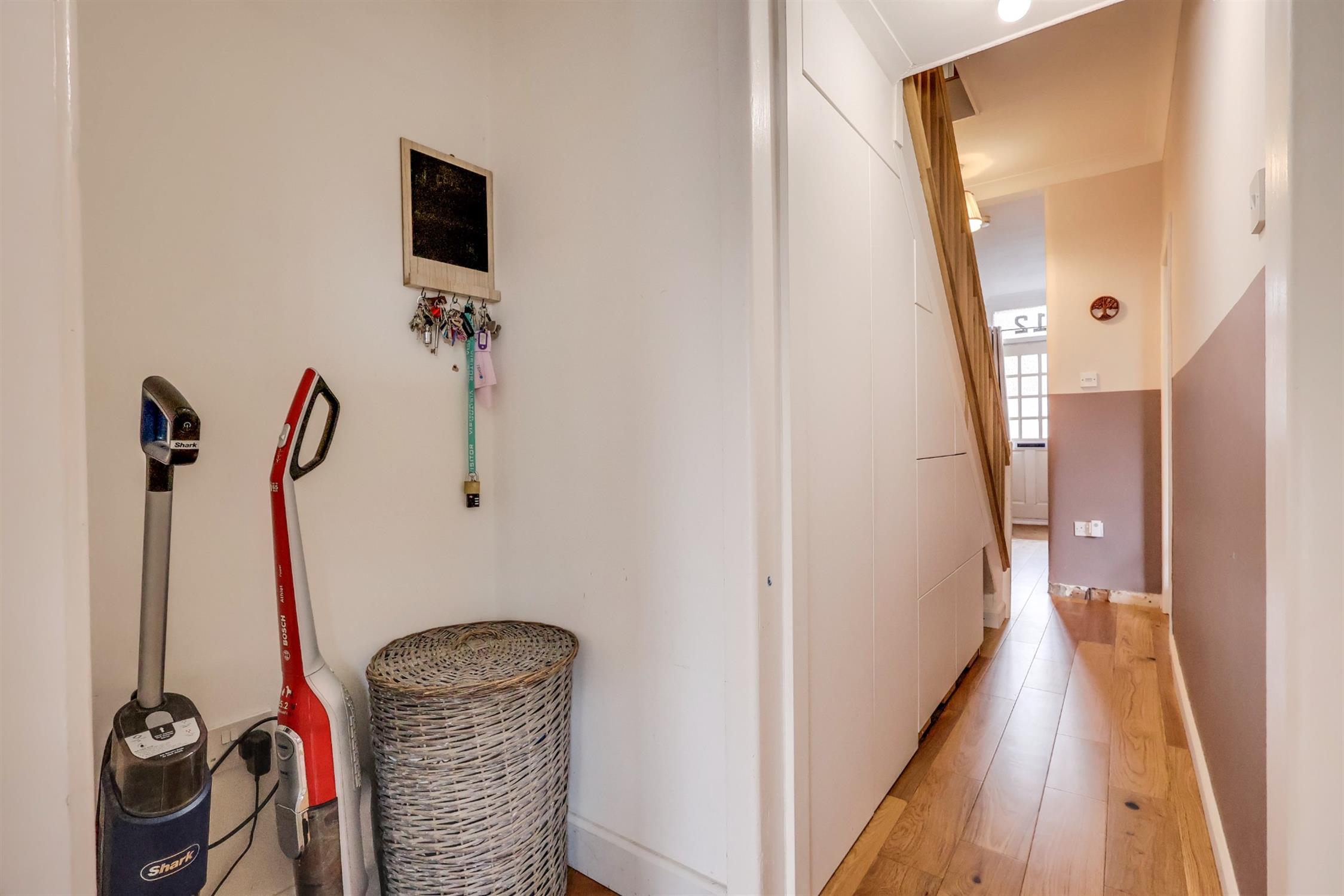 Smooth finish to coved ceiling, original door to front aspect, radiator, stairs rising to first floor with storage under, doors leading to: