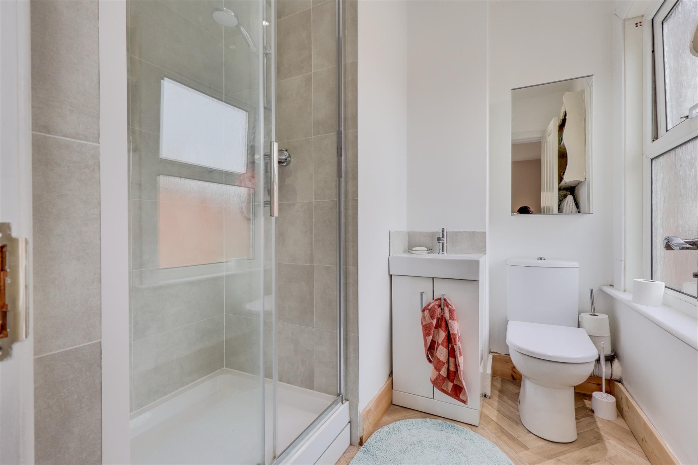 Smooth finish to ceiling, inset spotlights, double glazed window to side aspect, shower cubicle with rainfall style shower, low level WC and vanity hand wash basin, heated towel rail, tiled flooring.