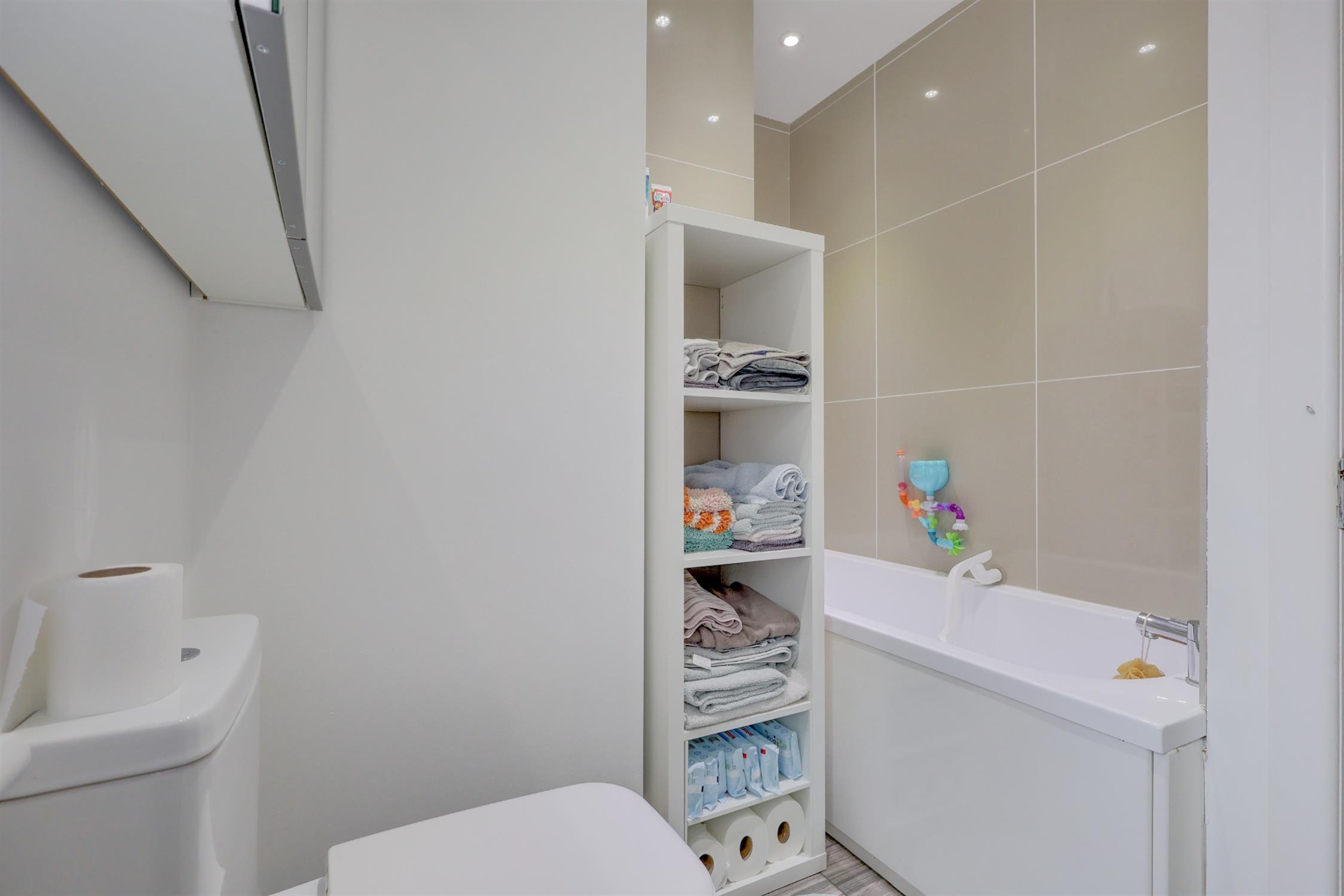 Smooth finish to ceiling, inset spotlights, double glazed window to side aspect, three piece suite comprising of panel enclosed bath with mixer taps, low level WC and hand wash basin, heated towel rail.