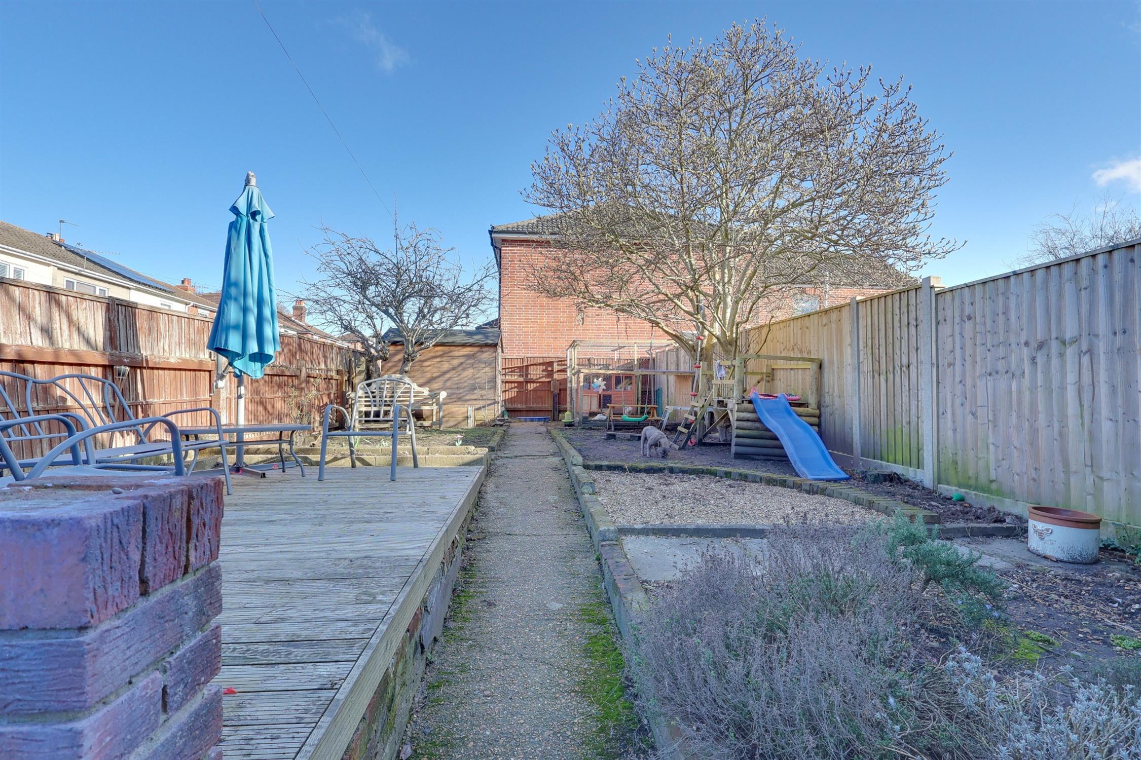 Fenced enclosed rear garden, patio seating area leading up to raised decked seating area, areas of lawn, decorative flower and shrub borders, magnolia tree, apple tree and camellia flowering plant, large hard-standing area to the side, side pedestrian access.