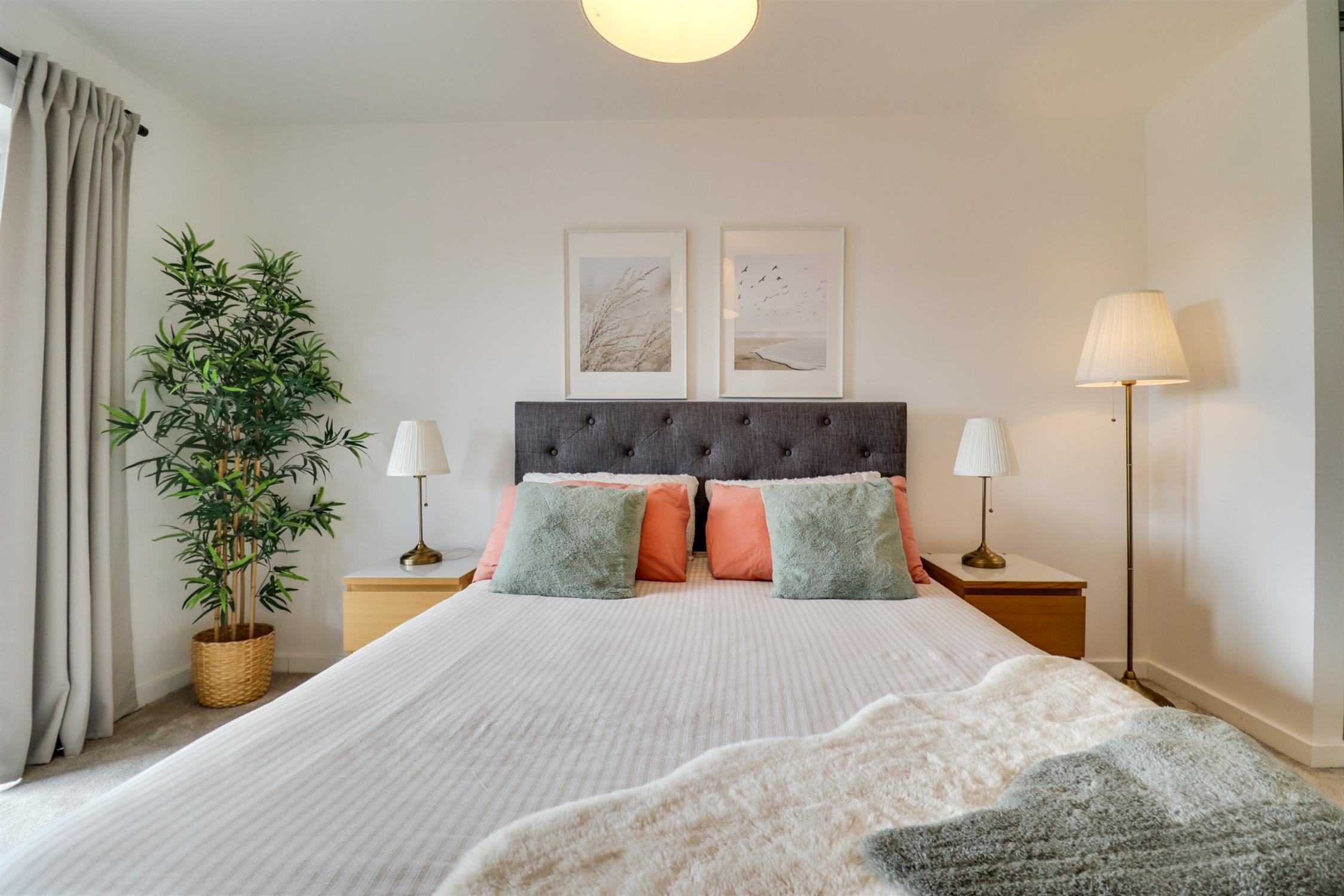 Smooth finish to ceiling, double glazed door and window to rear elevation onto balcony with further water views, built in wardrobes with mirror fronted sliding doors, radiator, door to: