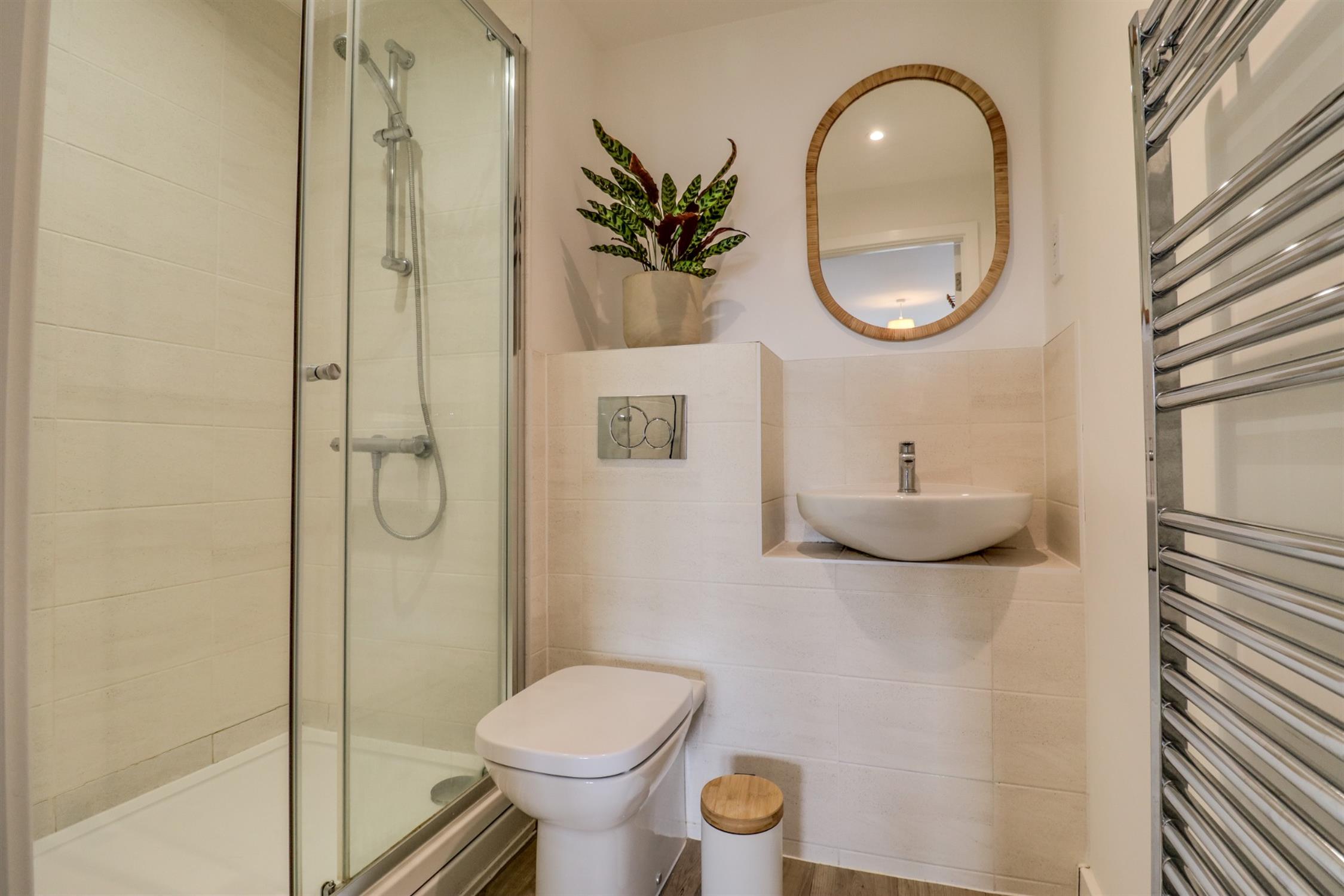 Smooth finish to ceiling with inset spotlights, shower cubicle with mains fed shower, wash hand basin and low level WC, heated ladder towel rail, tiling to applicable areas.