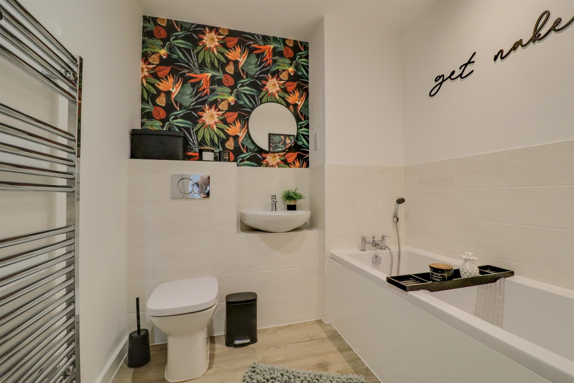 Smooth finish to ceiling with inset spotlights, three piece suite comprising panel enclosed bath, wash hand basin and low level WC, heated ladder towel rail, tiling to applicable areas.