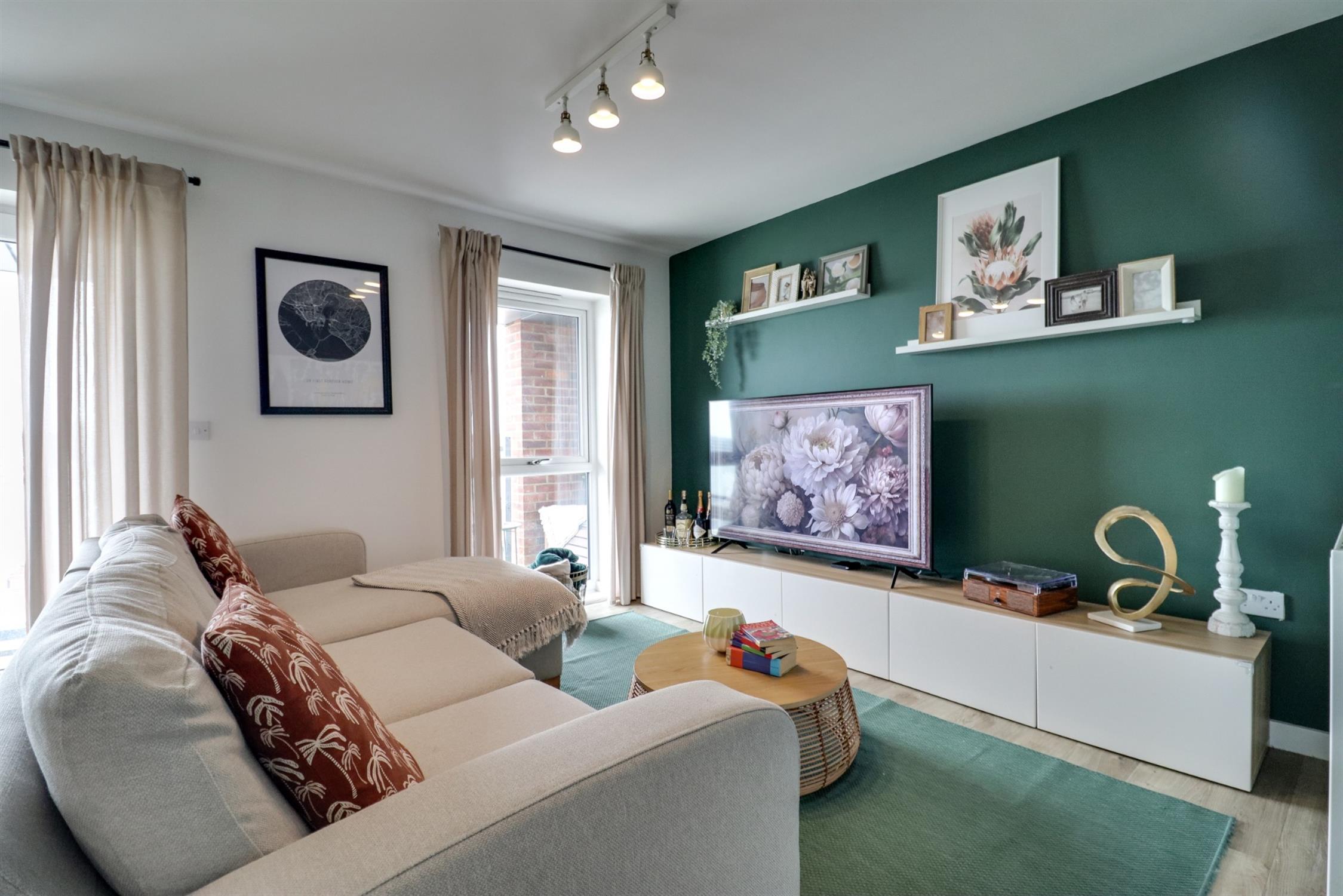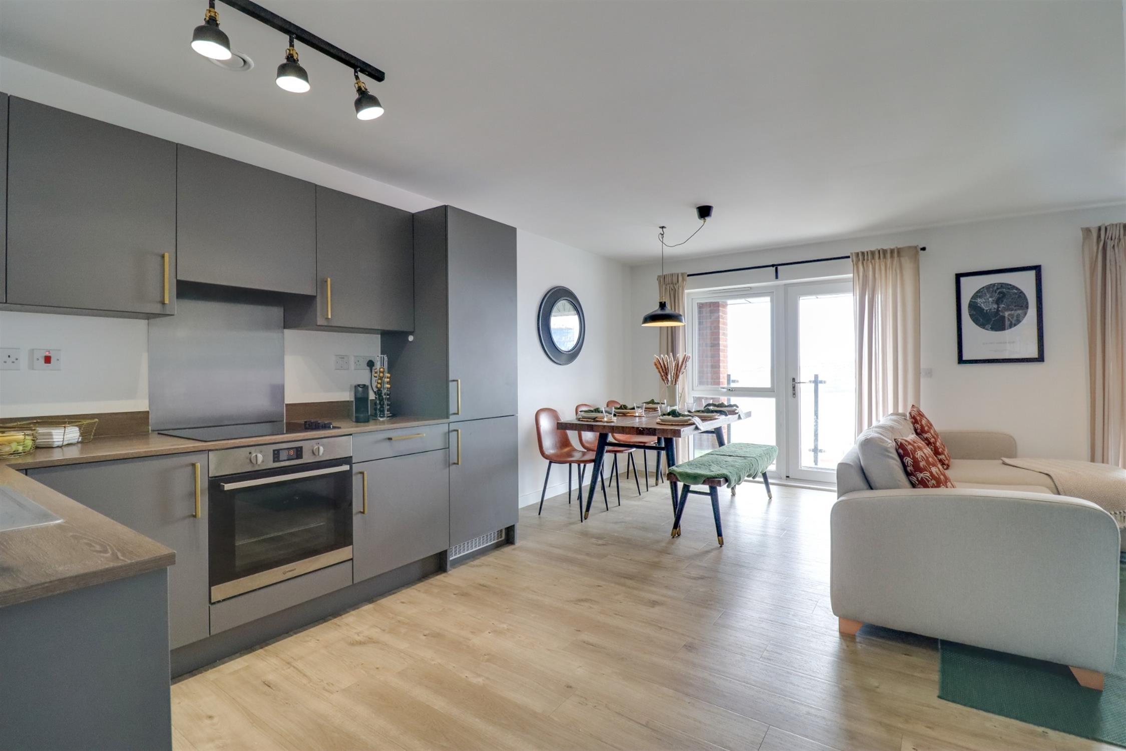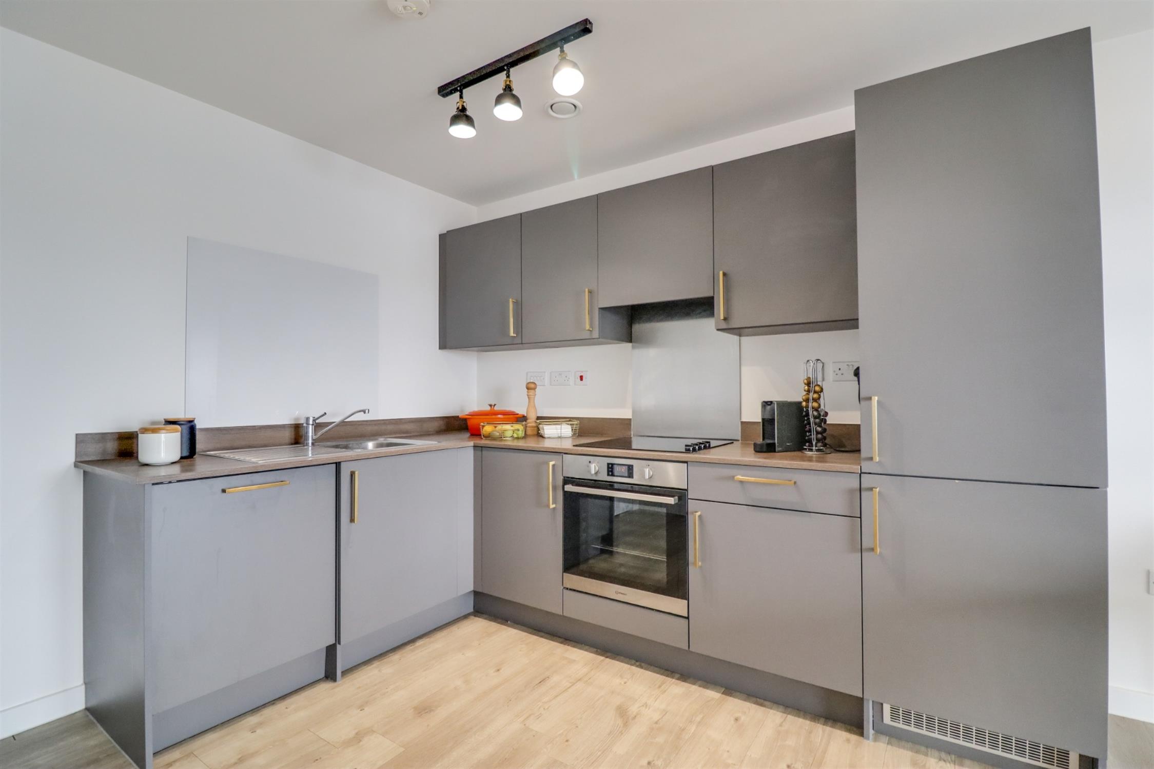 Smooth finish to ceiling, double glazed windows and door to front elevation onto balcony with water views, radiator Kitchen: range of modern wall base and drawer units with work surface over, stainless steel sink and drainer inset, integrated fridge freezer, dishwasher and oven with hob over.