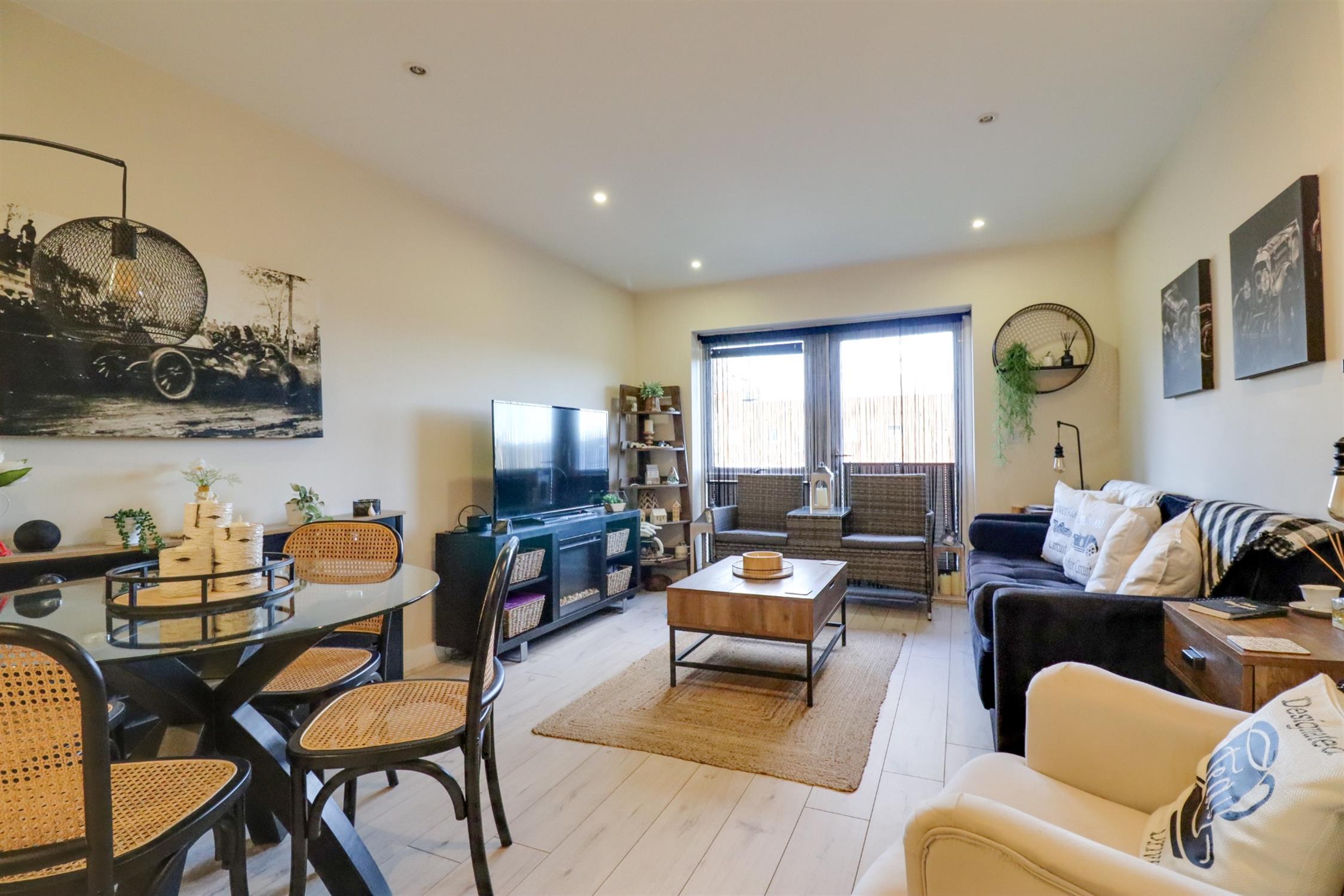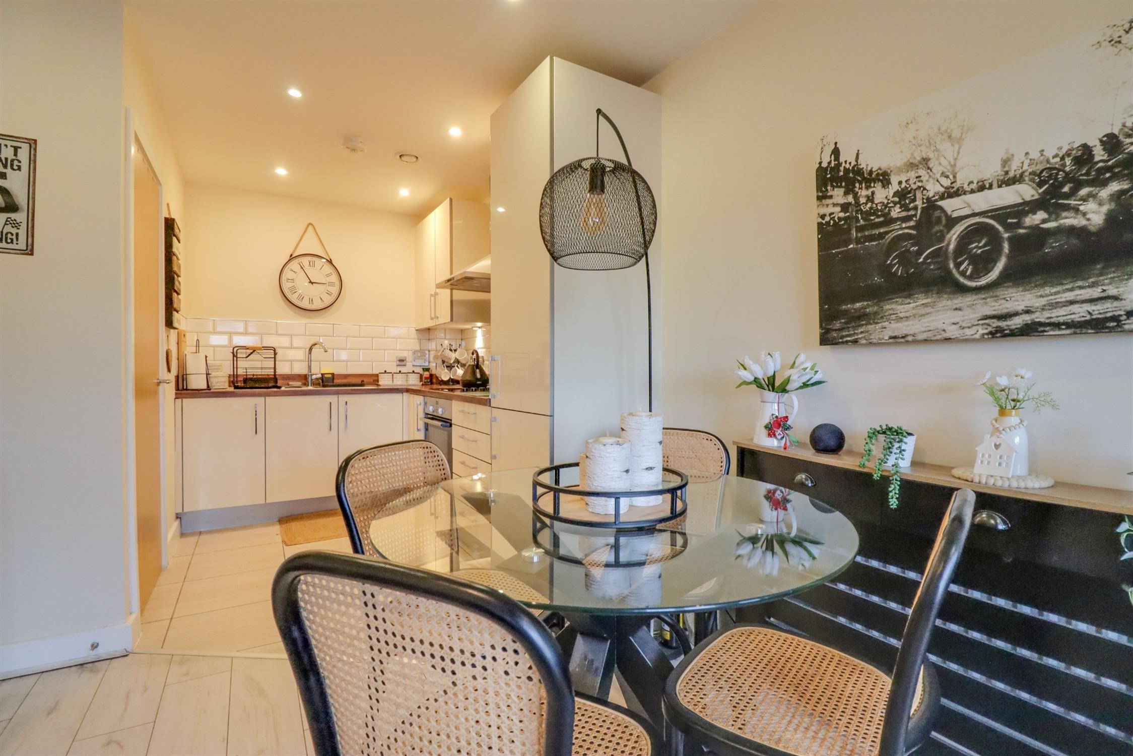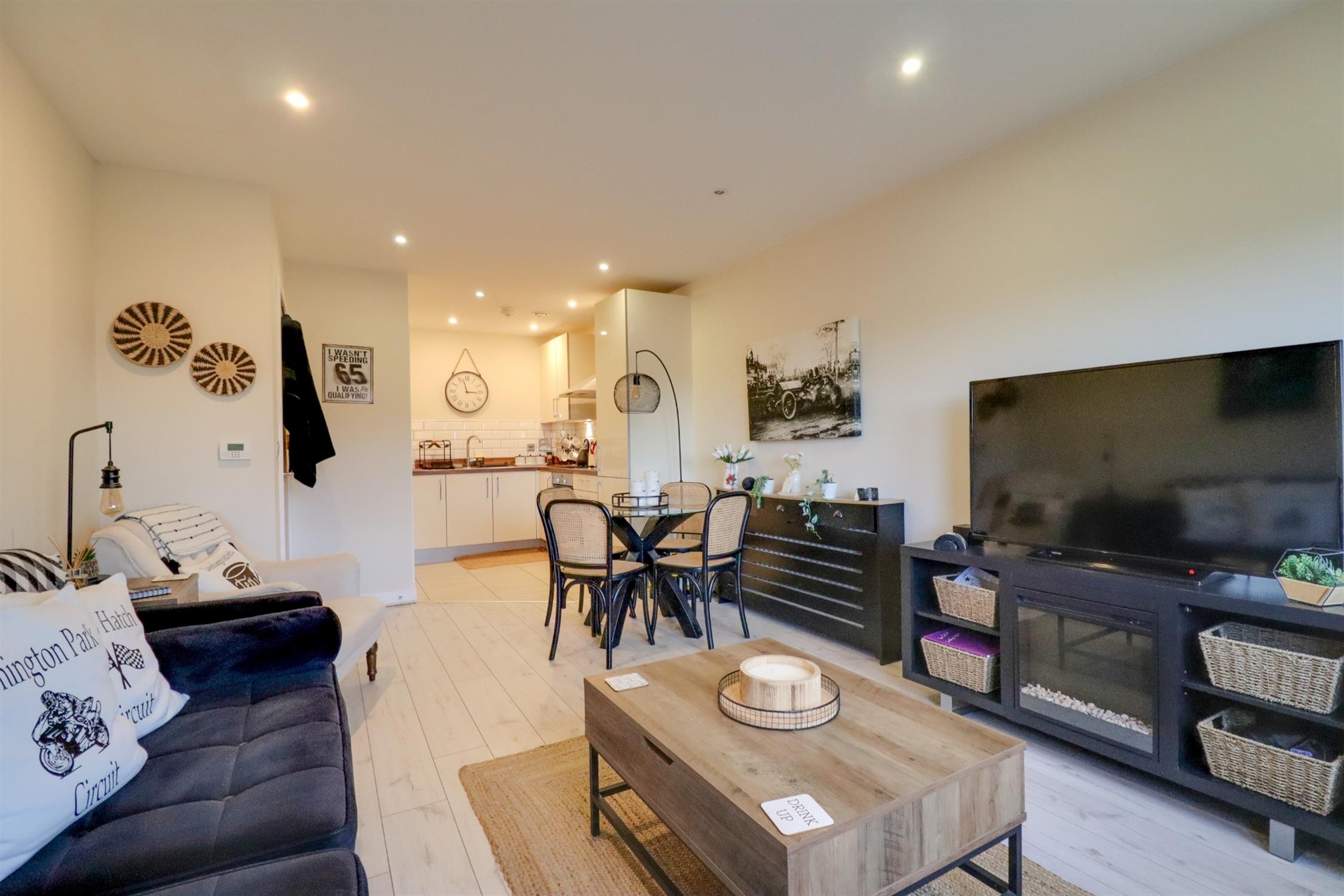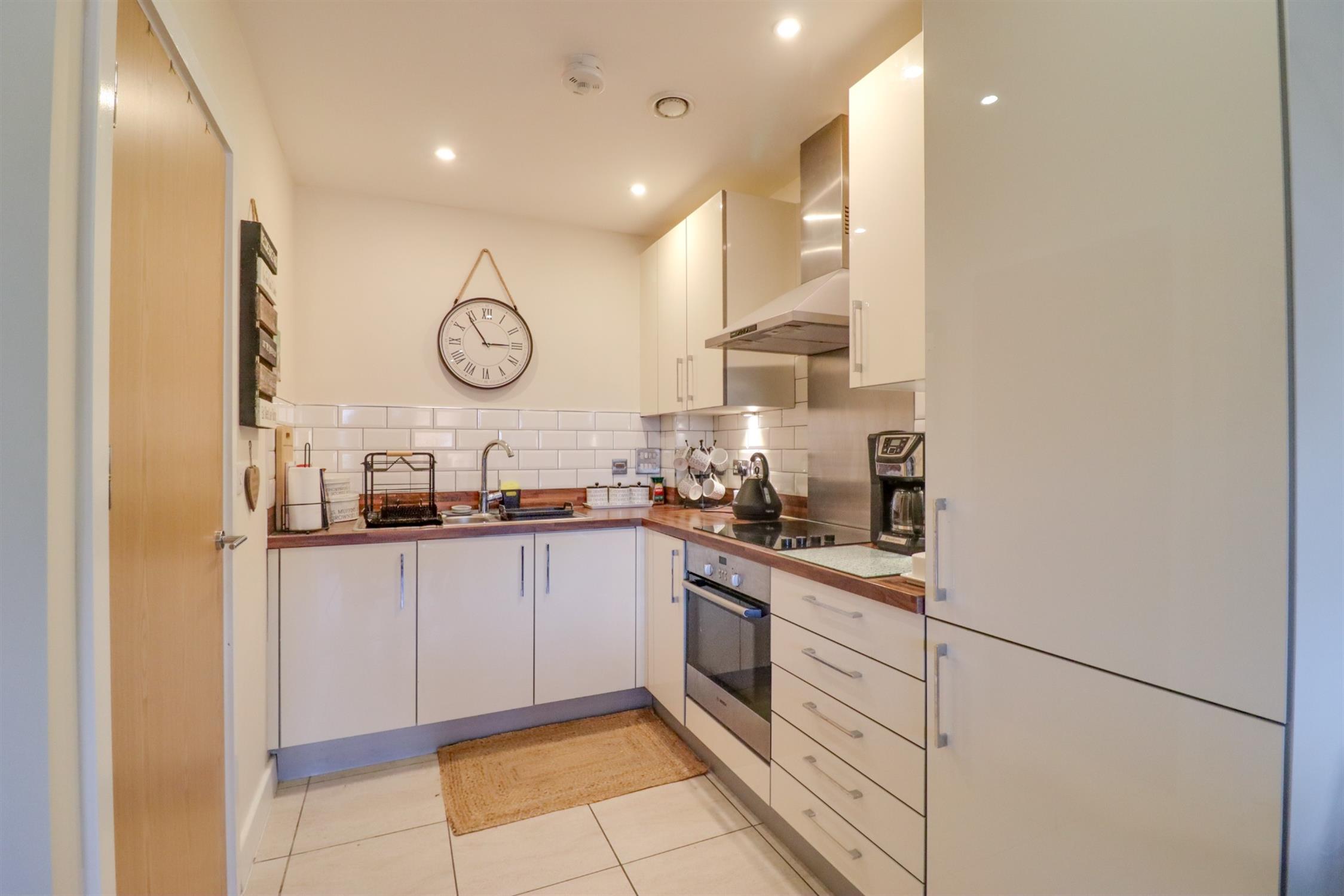 Lounge: Smooth finish to ceiling, double glazed door and window to rear elevation opening onto balcony, radiator Kitchen: smooth finish to ceiling with inset spotlights, a range of modern wall and base drawer units with roll top work surface over, built in oven and electric hob over, stainless steel sink and drainer inset, integrated dishwasher and fridge freezer & larder cupboard.