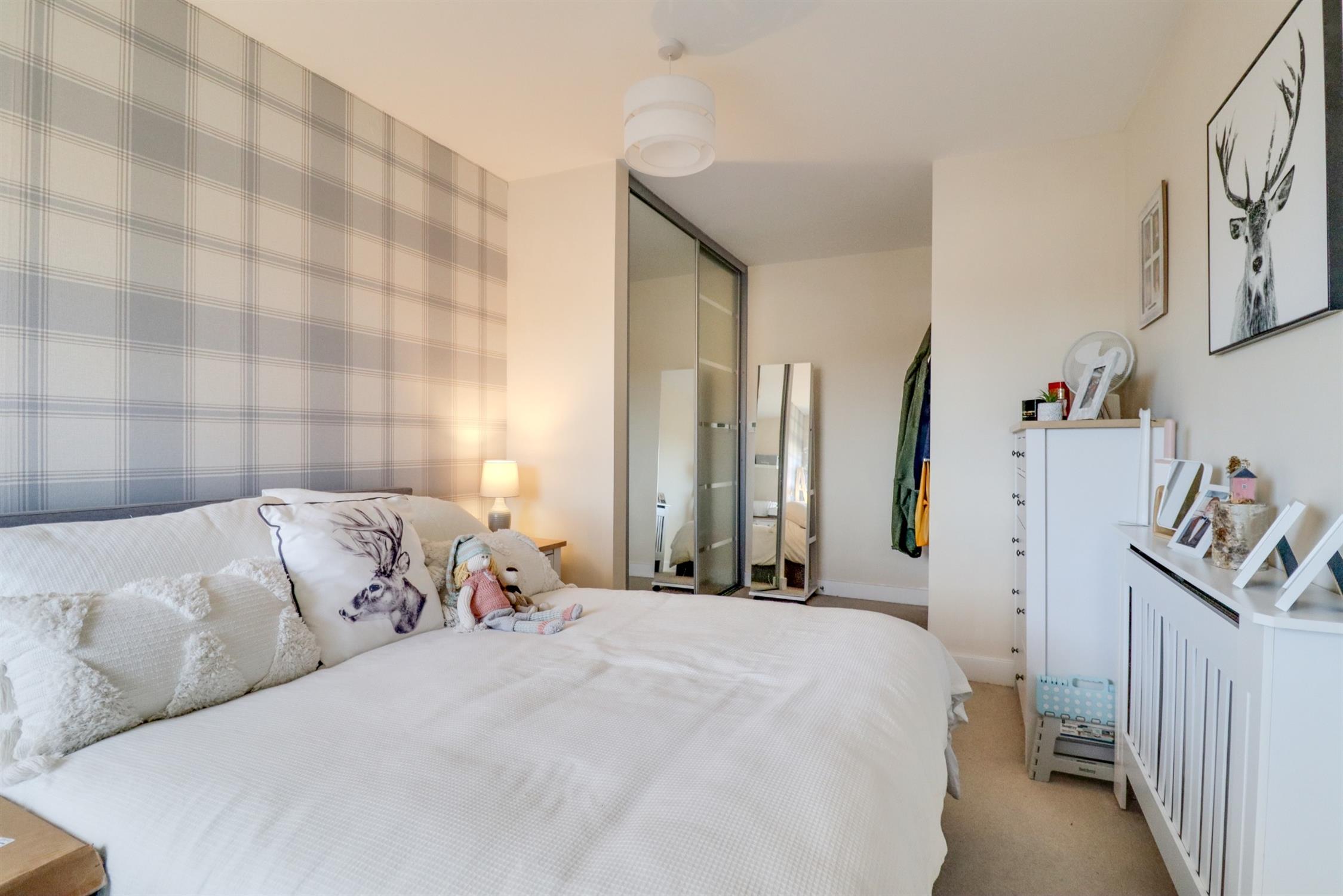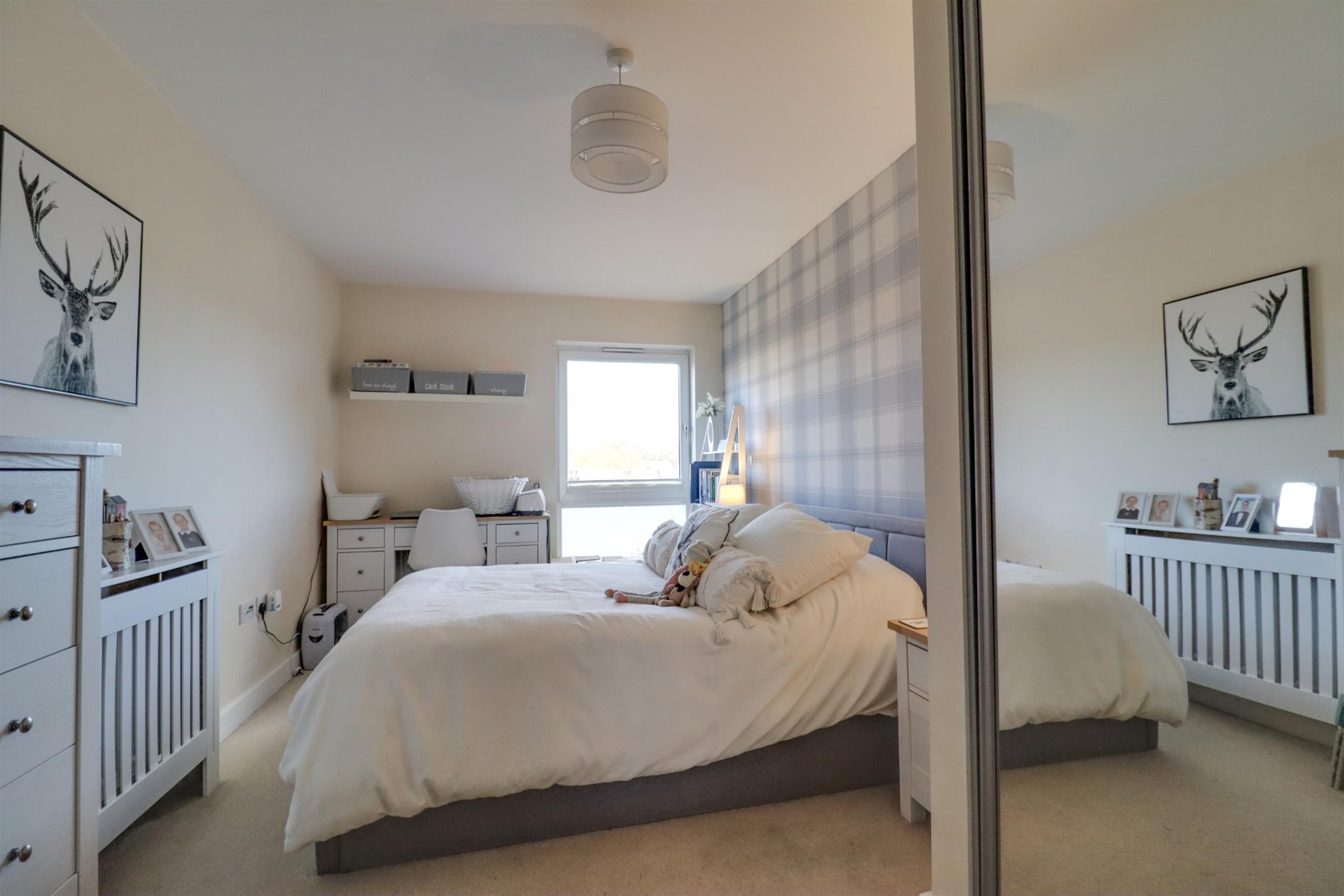 Smooth finish to ceiling, full height double glazed window to front aspect, built in double wardrobe with mirror fronted sliding doors, radiator.