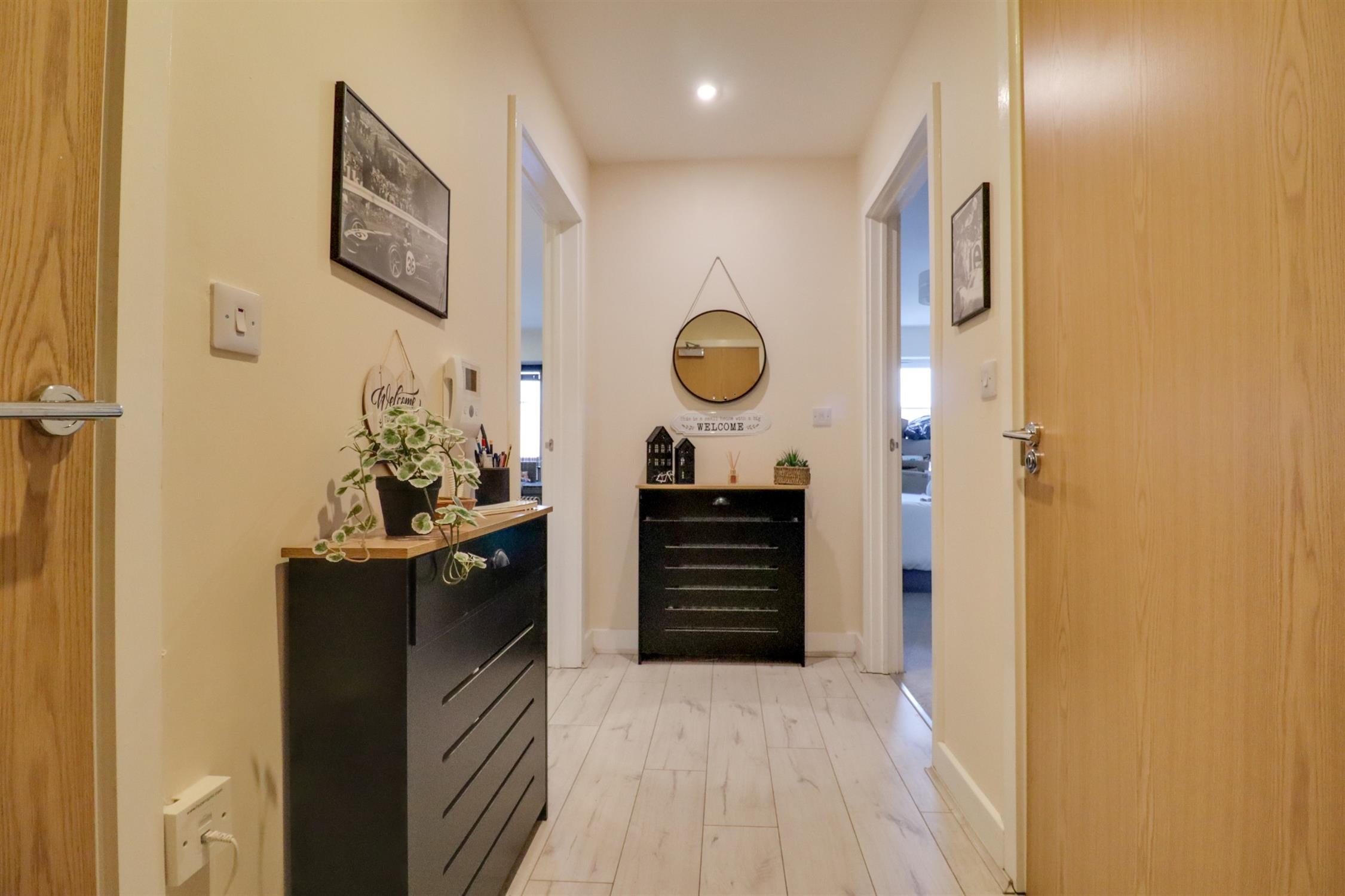 Smooth finished to ceiling, utility cupboard housing heat interface unit and washer/dryer, doors to all rooms.