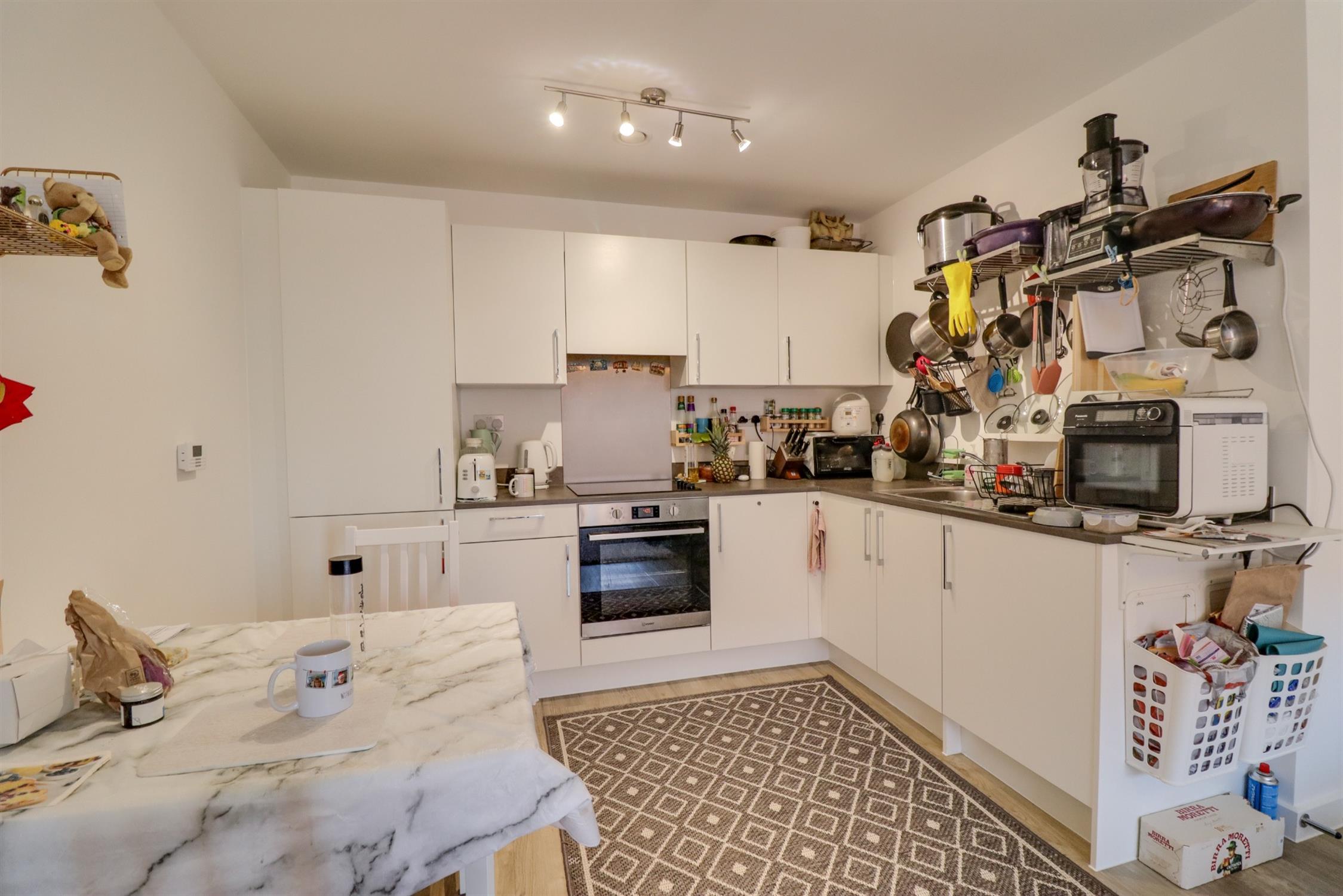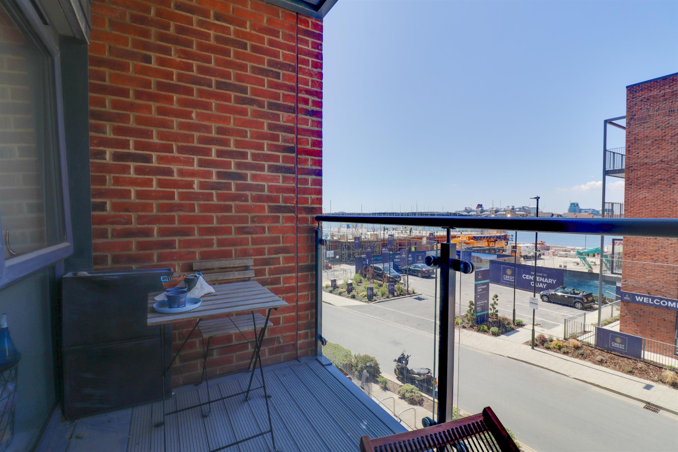Smooth finish to ceiling, double glazed window and door to front elevation leading onto balcony with partial water views, radiator Kitchen: range of modern wall base and drawer units with roll top work surface over, stainless steel sink and drainer inset, integrated fridge freezer, integrated oven with hob and extractor fan over.