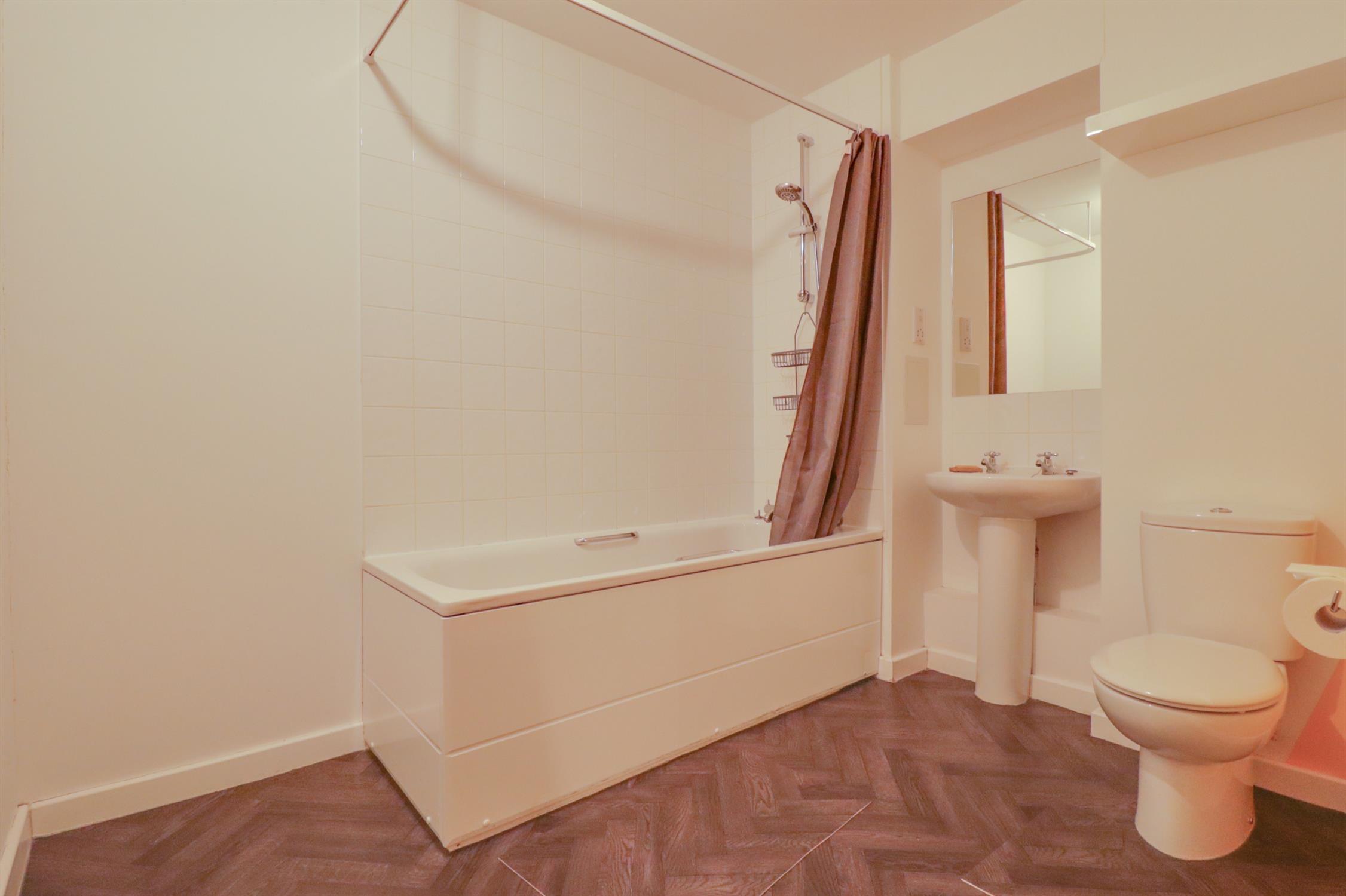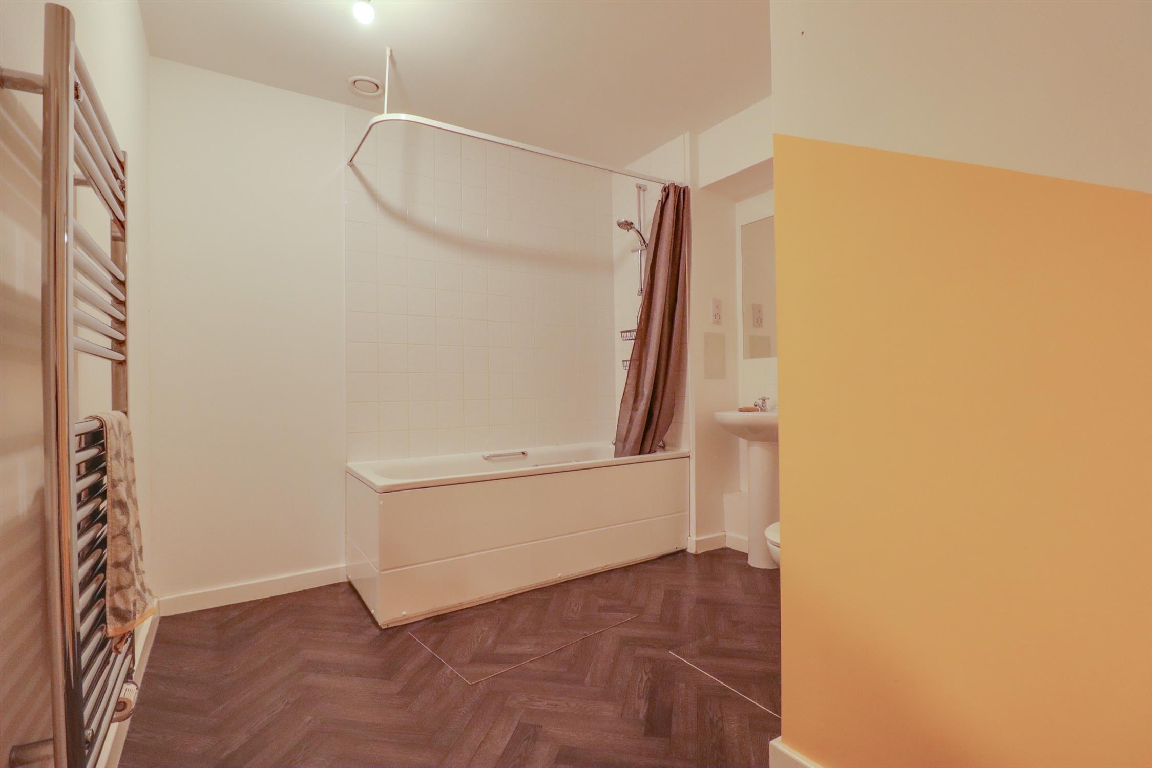 Smooth finish to ceiling, panel enclosed bath with shower over, wash hand basin and WC, heated ladder towel rail, tiling to applicable areas.