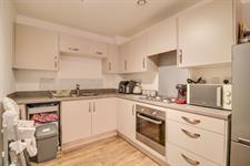 Smooth finish to ceiling, double glazed window and door to front elevation onto garden terrace, range of matching wall base and drawer units with roll top work surface over, stainless steel sink and drainer inset, integrated oven and hob with extractor fan over, space for fridge freezer and dishwasher, radiator.