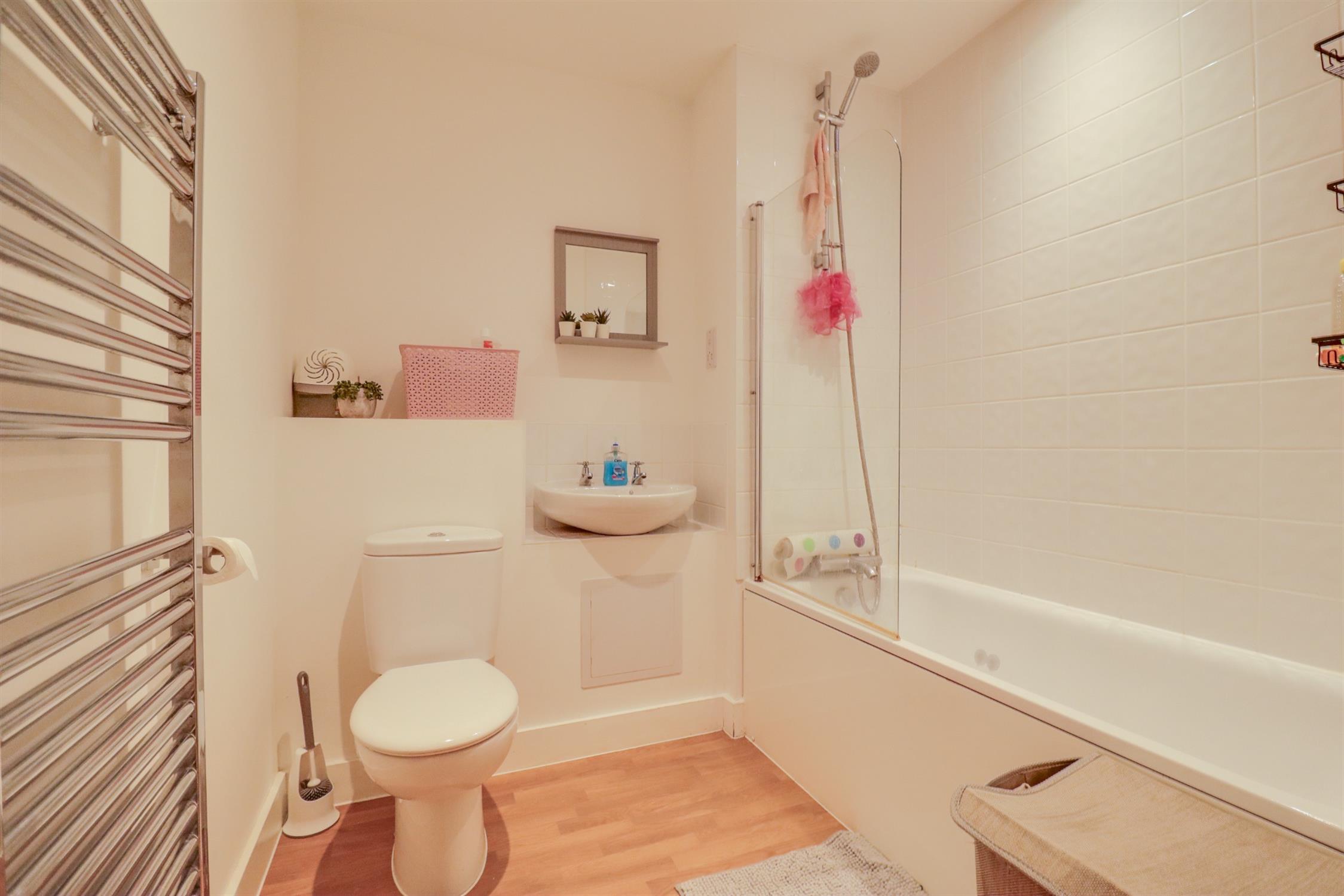 Smooth finish to ceiling with inset spotlights, panel enclosed bath with shower over, wash hand basin and low level WC, heated ladder towel rail, tiling to principle areas.