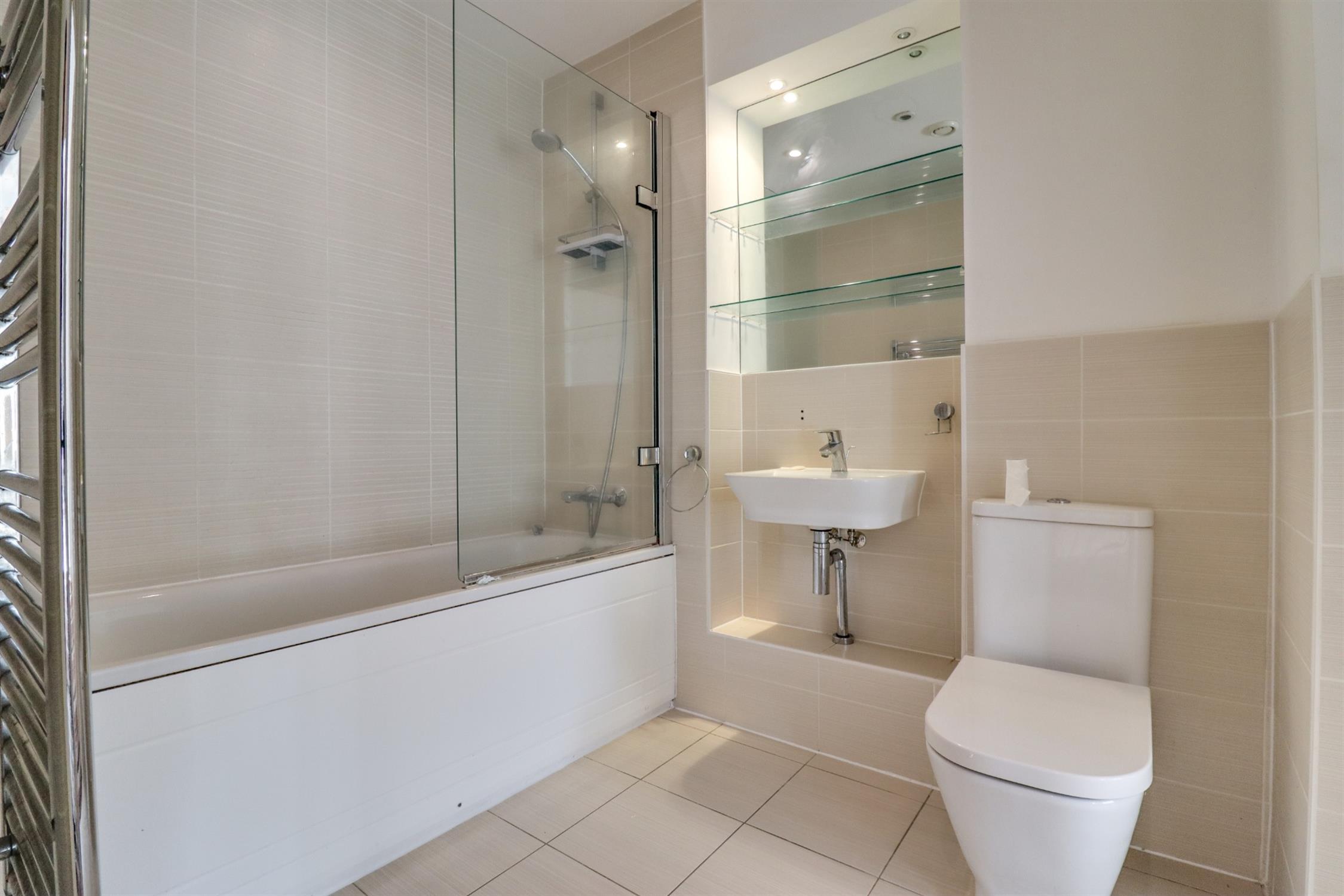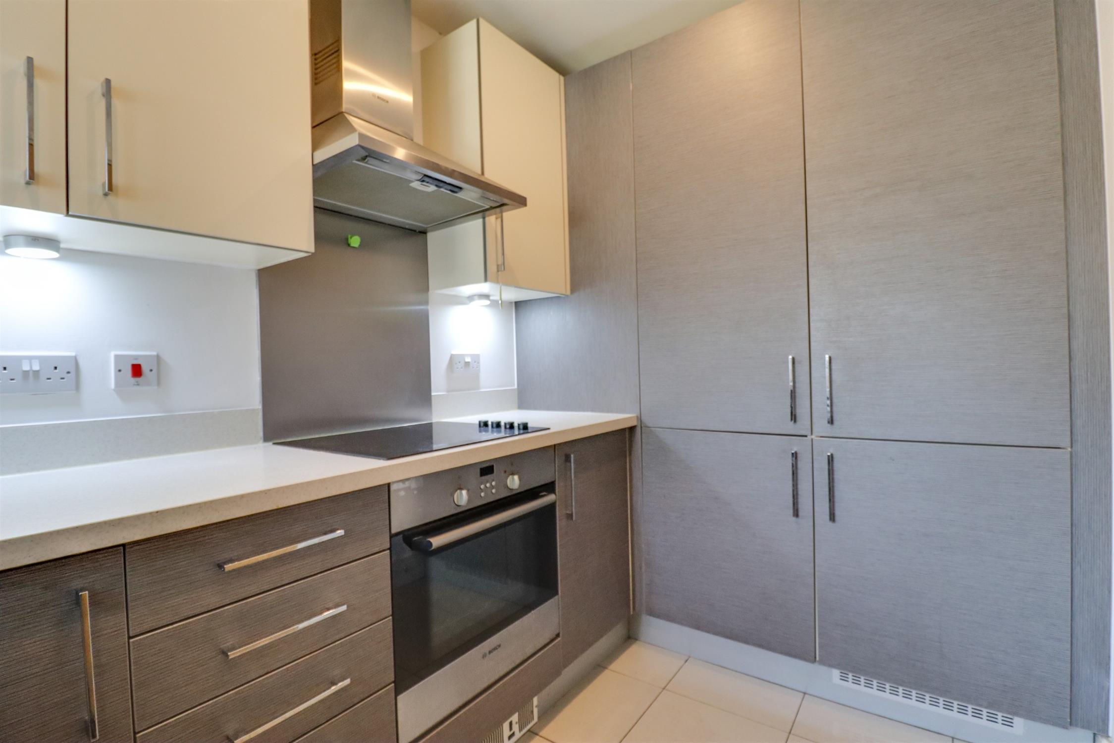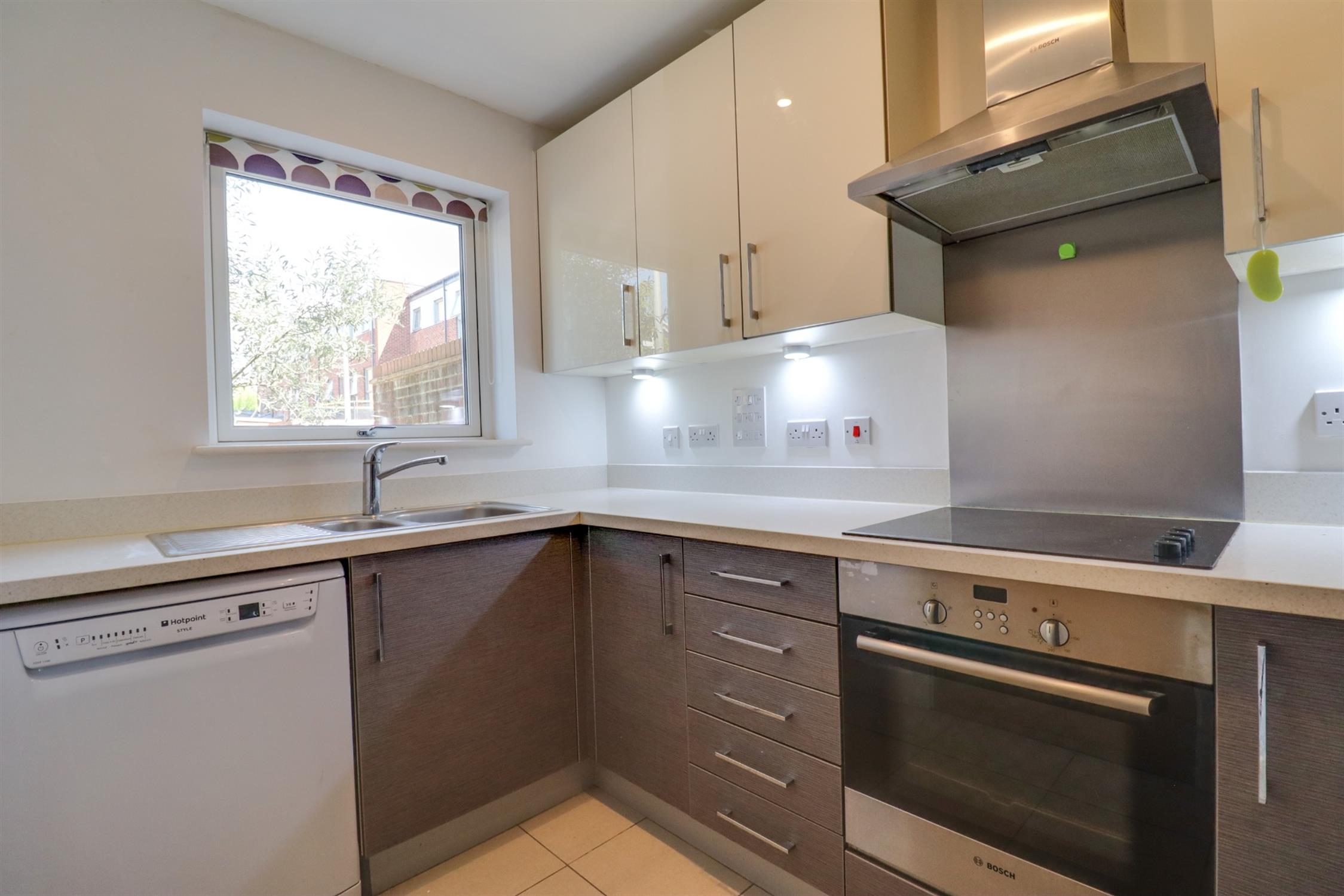 Modern fitted kitchen with range of wall and base units, inset one and half bowl sink and drainer, built-in oven with hob and extractor over, built-in fridge/freezer.