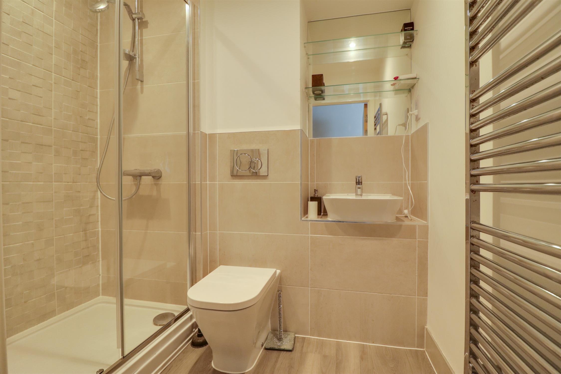 Smooth finish to ceiling, walk in shower cubicle with mains fed shower, wash hand basin, low level WC, heated ladder towel rail, tiling to applicable areas, laminate flooring.