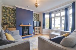 Smooth finish to coved ceiling, double glazed bay window to front aspect, fireplace with feature log burner and mantle piece, bespoke built in storage cupboard, wood effect flooring and radiator.