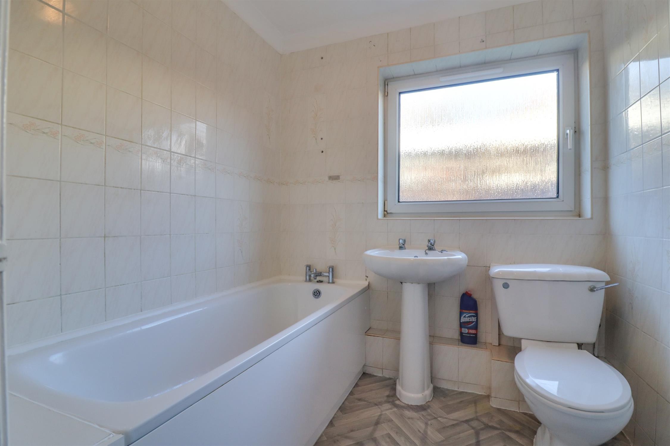 Smooth finish to coved ceiling, double glazed window to front elevation, panel enclosed bath, low level WC and wash hand basin, heated ladder towel rail, fully tiled walls.