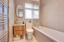 Smooth and coved ceiling, double glazed obscured window to side, panel enclosed bath with mains fed shower over and additional rainfall shower attachment, WC, wash hand basin, ladder towel rail, tiled floor and walls.
