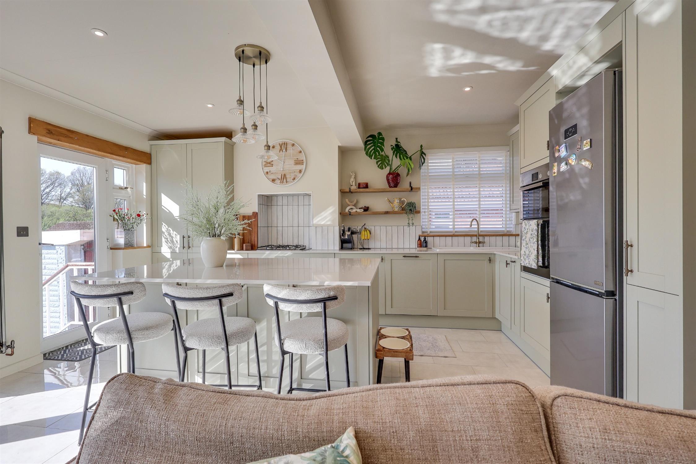Outside, the landscaped south facing garden provides a private and tranquil setting with a woodland backdrop, ideal for both relaxation and entertaining. Two spacious patio areas offer perfect spots for outdoor dining or enjoying evening drinks, while decorative flower borders and a well-maintained lawn add to the appeal. A detached garage and garden shed provide additional storage and practicality. Completing this exceptional home is a generous block-paved driveway, offering ample off-road parking. This is a truly impressive property that must be seen in person to fully appreciate the quality of design and craftsmanship throughout. Add benefits include a new combination boiler (2024) and planning permission (24/01114/FUL) for a loft conversion to create two further bedrooms & a bathroom.
