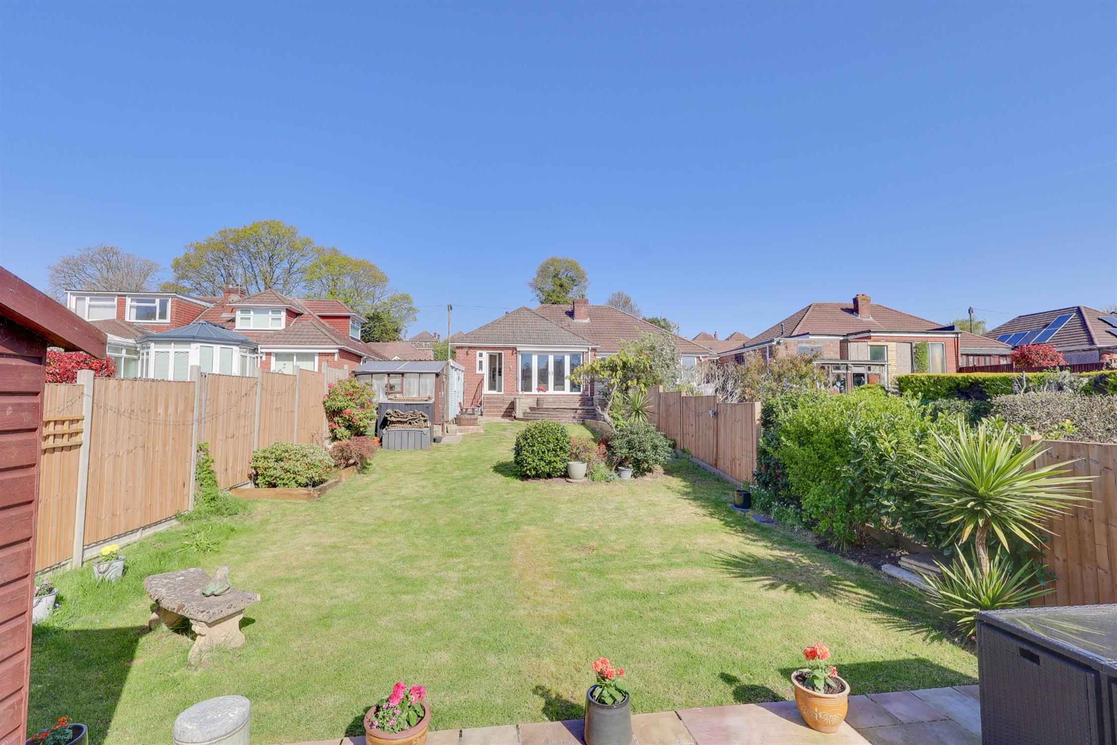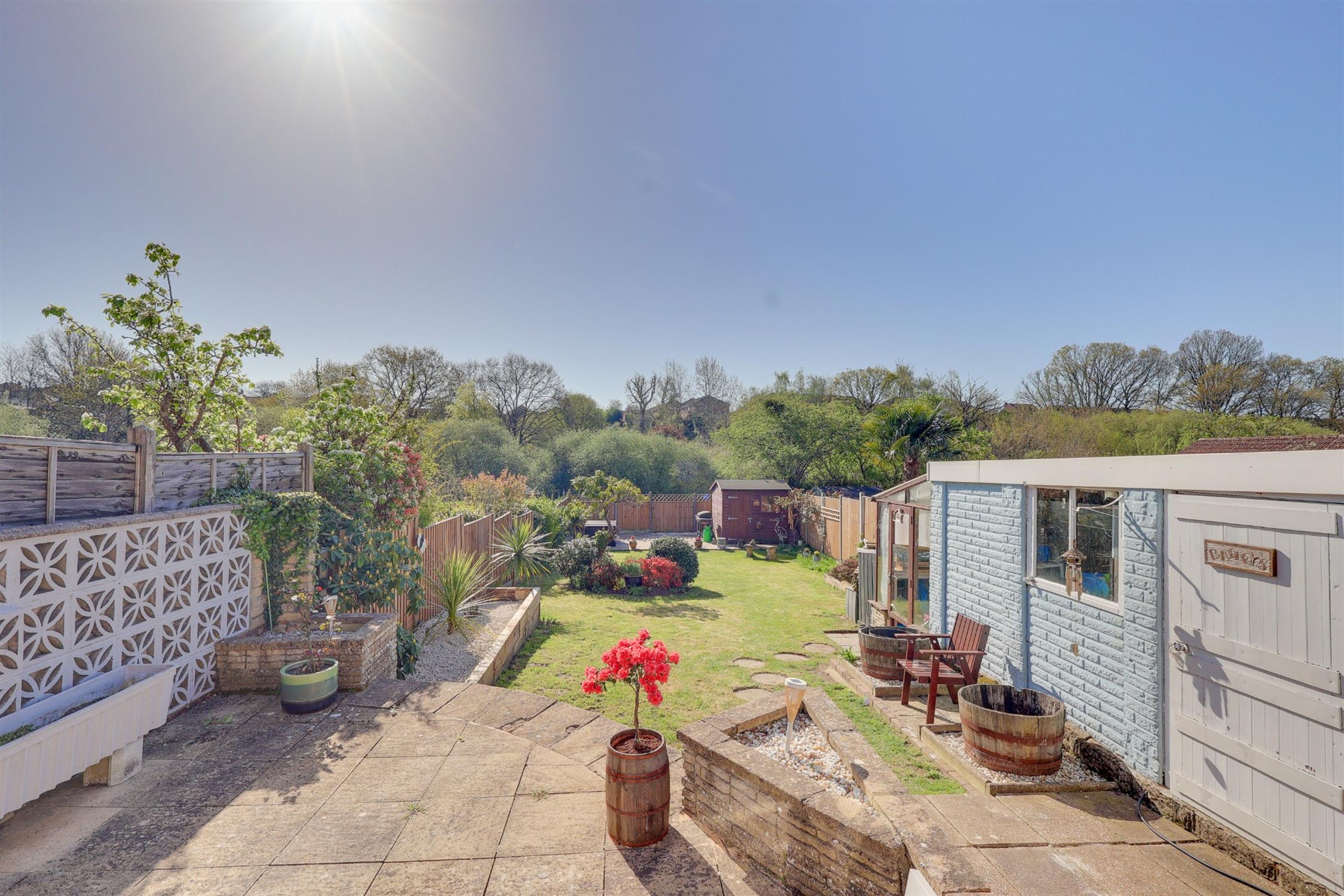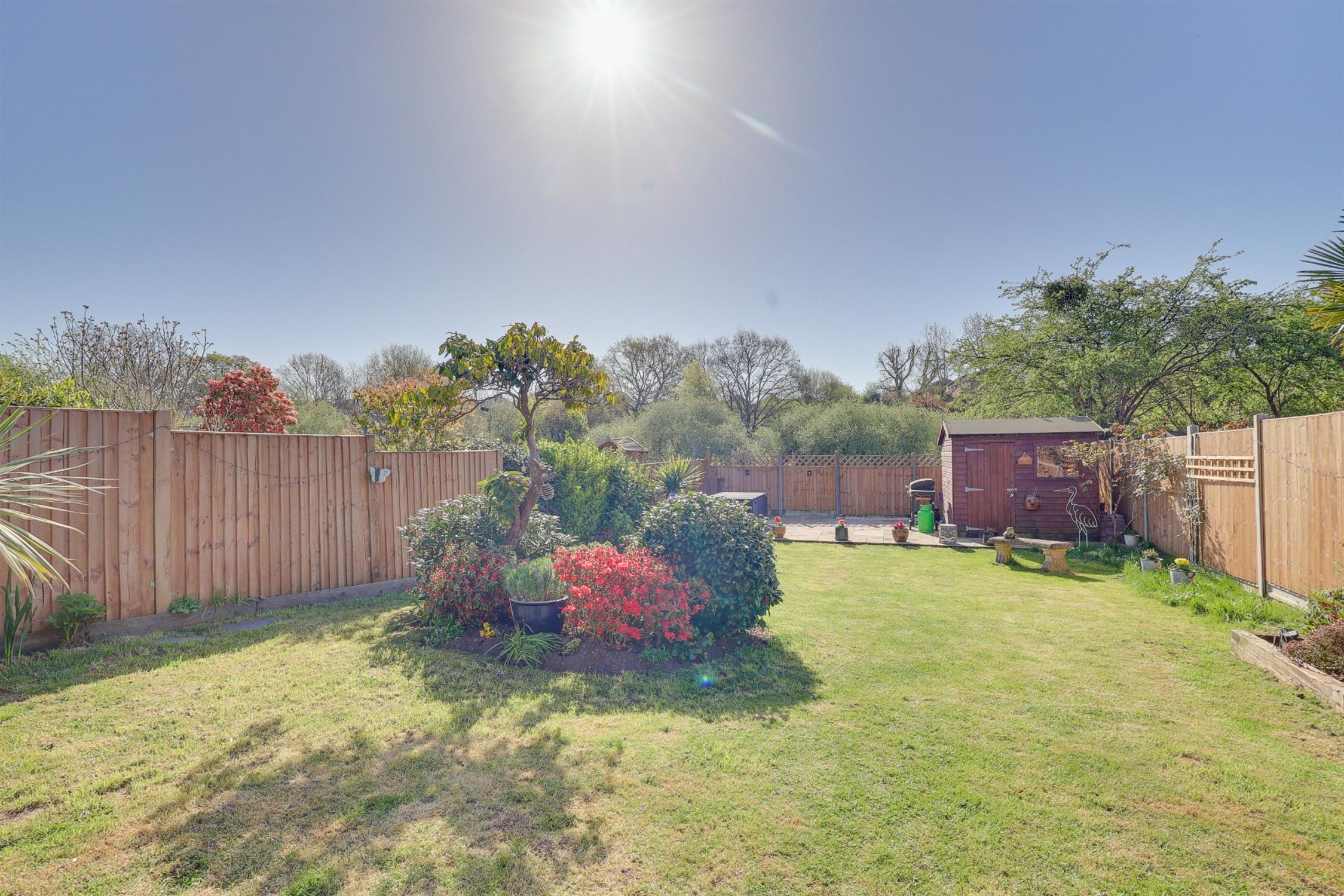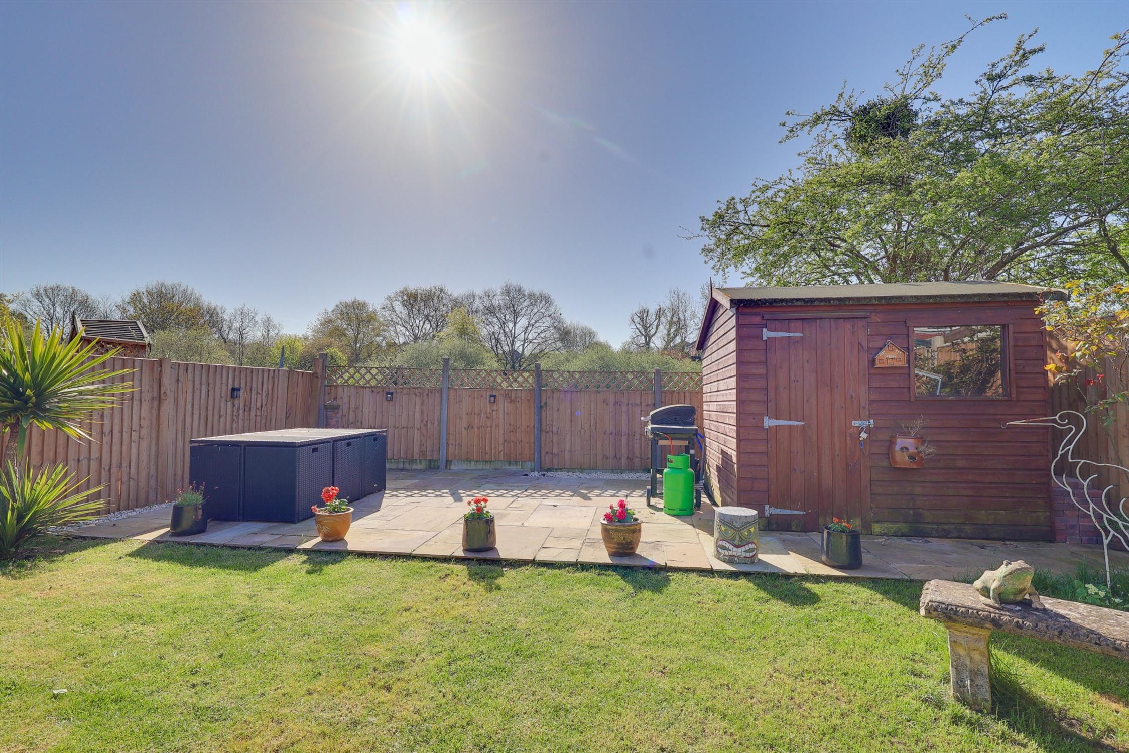 Fence enclosed rear garden, mainly laid to lawn with patio seating area, shed, side access.