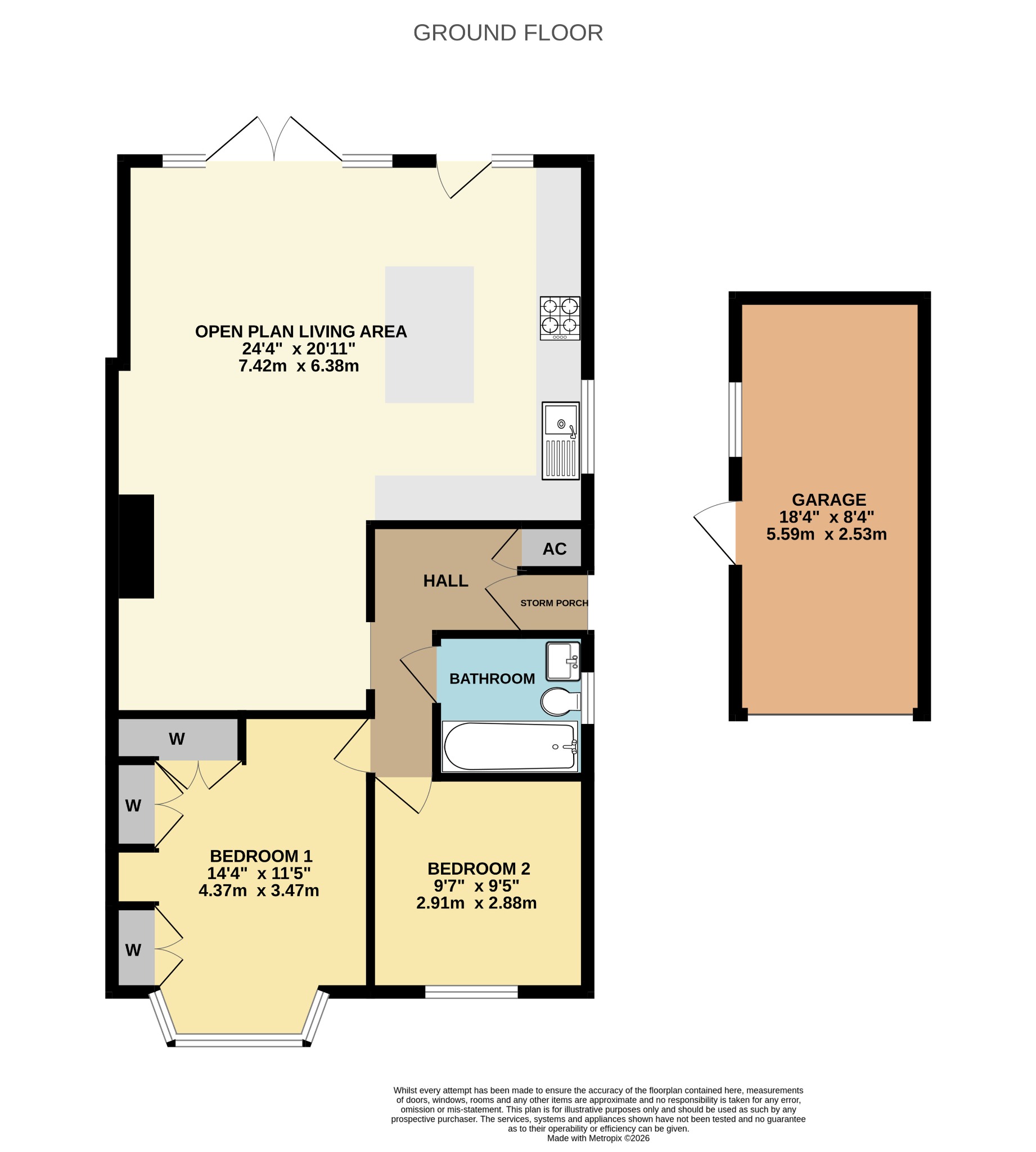 24' 4" (7.42m) max x 20' 11" (6.38m) max: