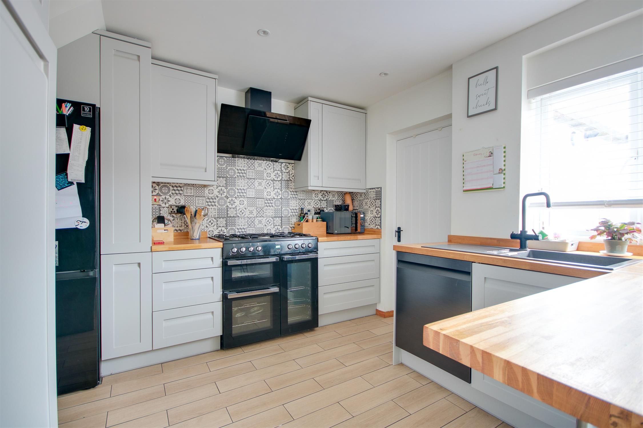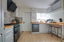 Smooth ceiling, double glazed window to rear, a range of wall, base and drawer units with work surface over, sink and drainer inset, breakfast bar, space for appliances, under floor heating, door to: