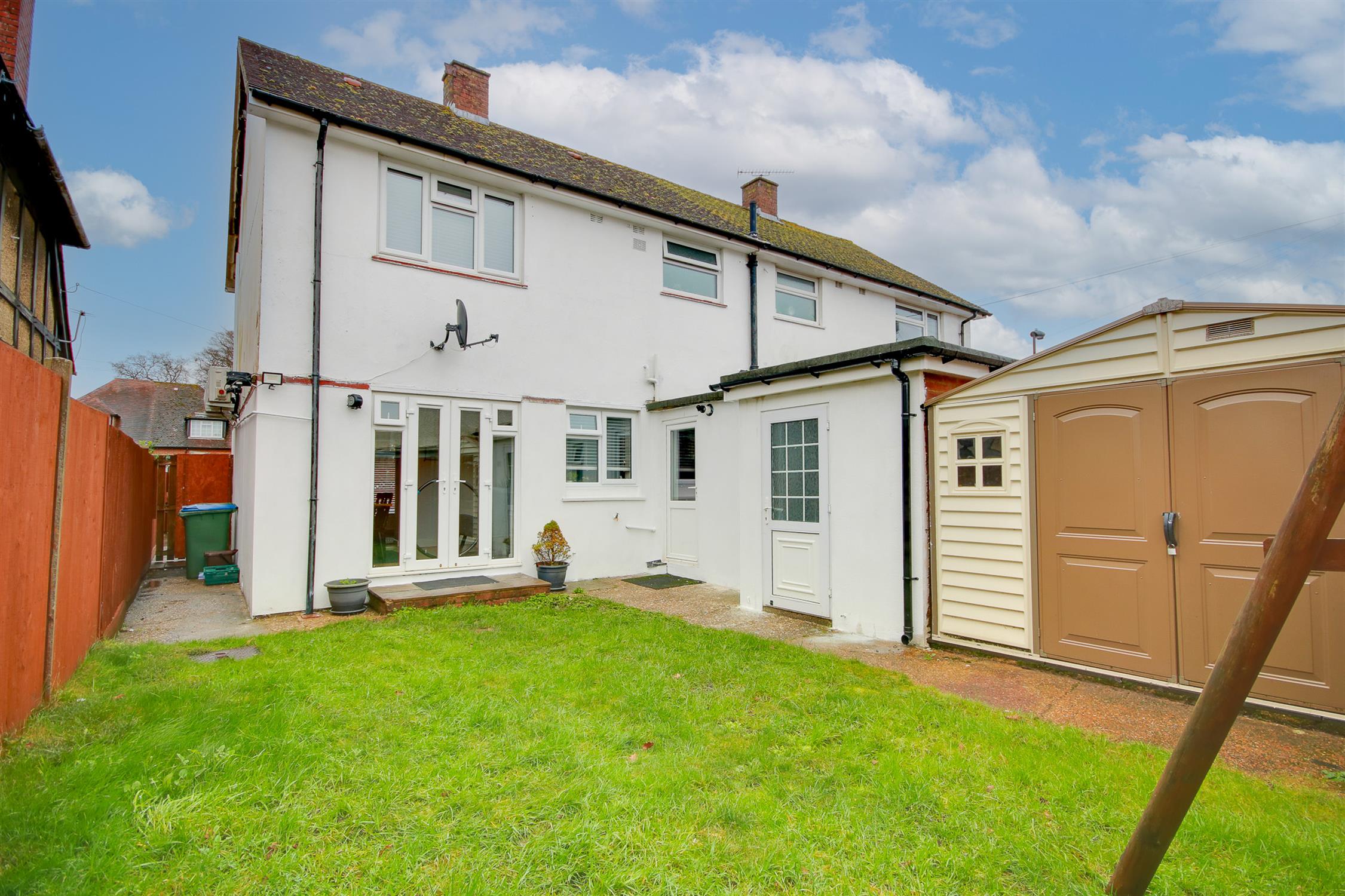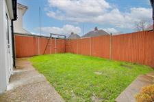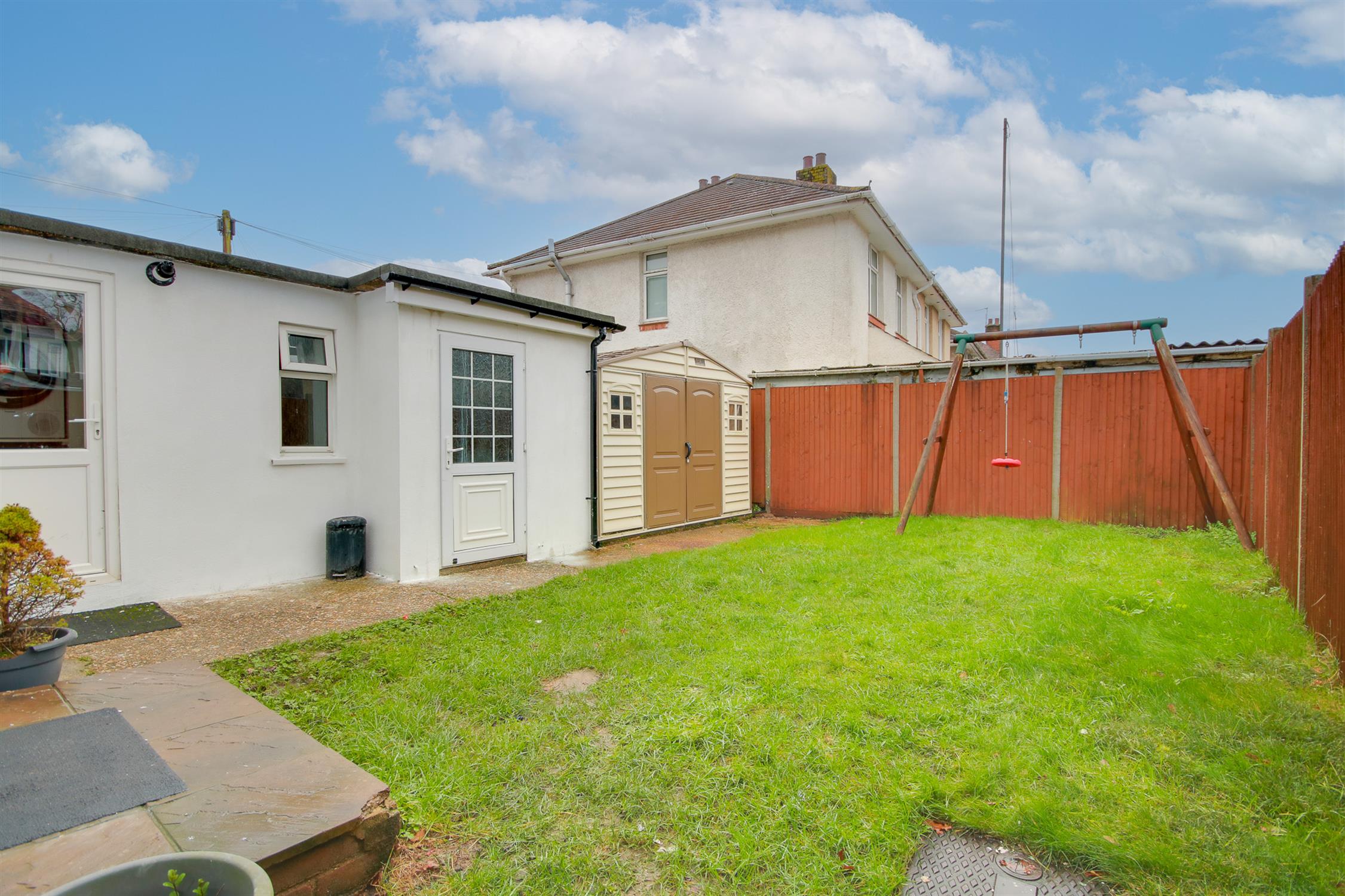 Fence enclosed rear garden, mainly laid to lawn, shed, side access, outside tap.