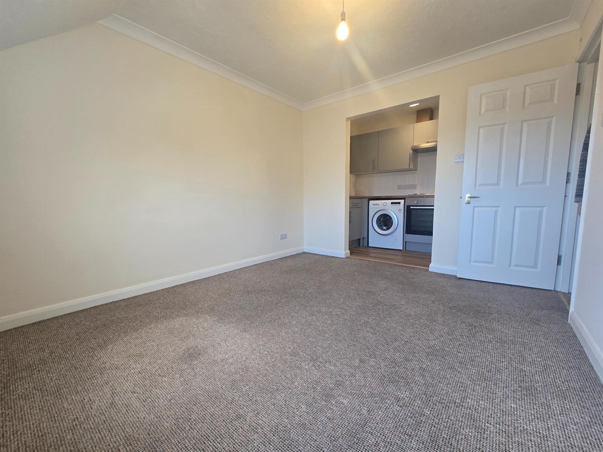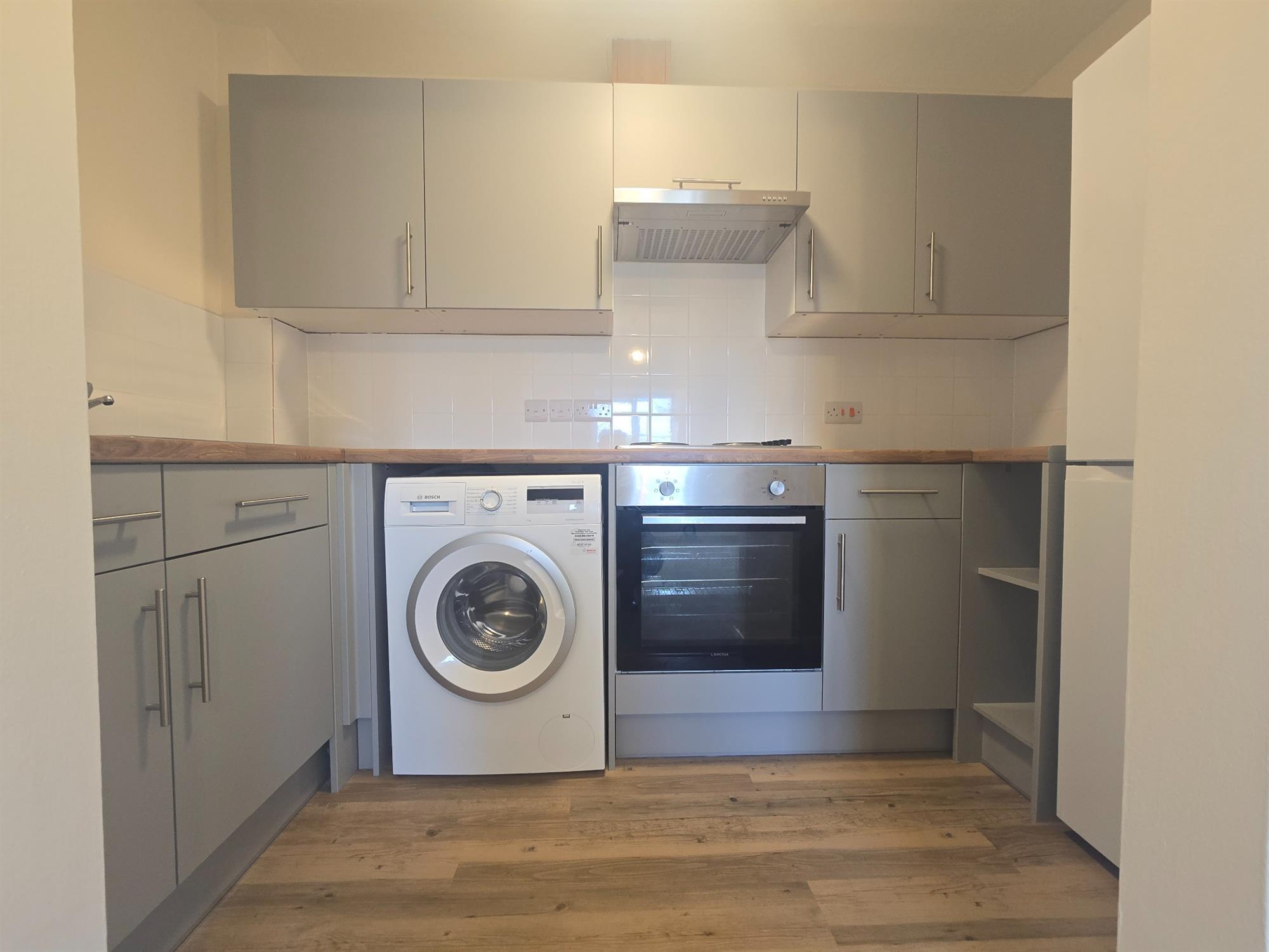KITCHEN - Open-plan leading from lounge, range of wall and base units with electric hob & oven, under-counter washing machine and free-standing fridge/ freezer included.