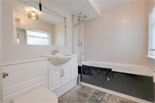 Textured finish to ceiling, double glazed window to rear elevation, panel enclosed bath with mains fed shower over, low level WC and vanity wash hand basin, tiling to principle areas.