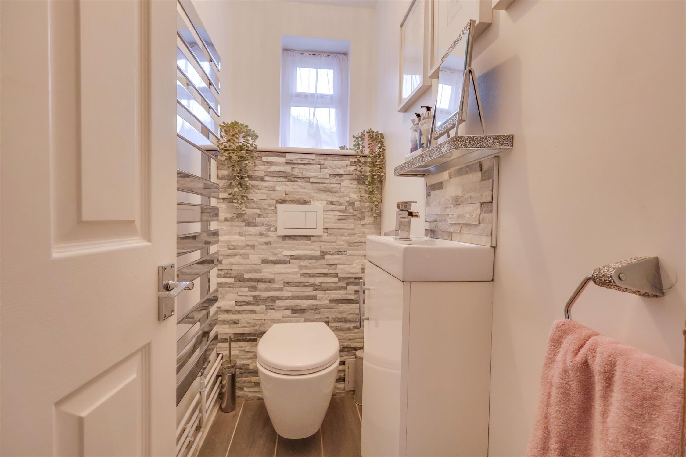 Textured finish to ceiling, double glazed window to rear elevation, low level WC and wash hand basin, heated towel rail.