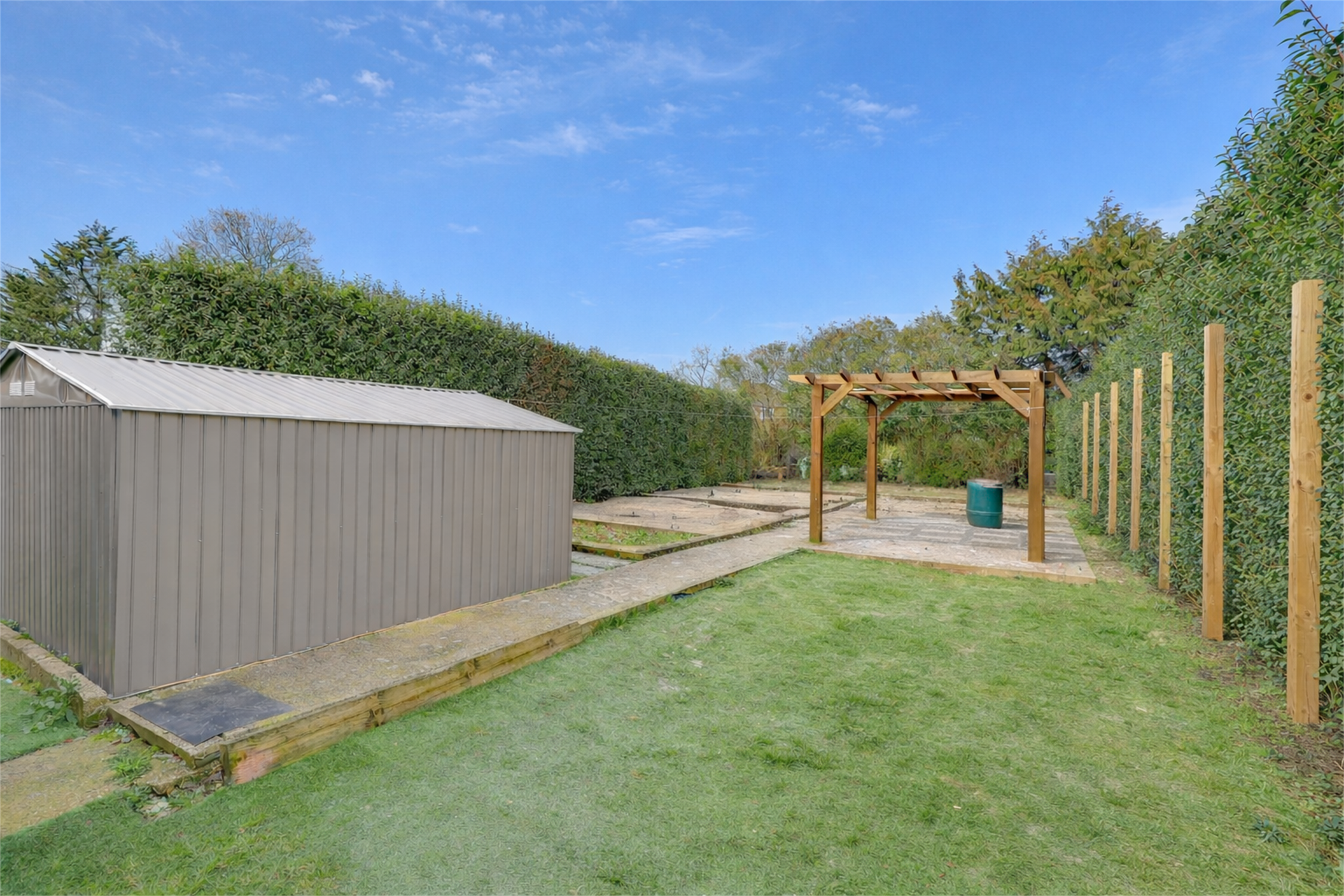 Mature shrub borders, a pathway leading to a paved area with a pergola, an artificial lawn.