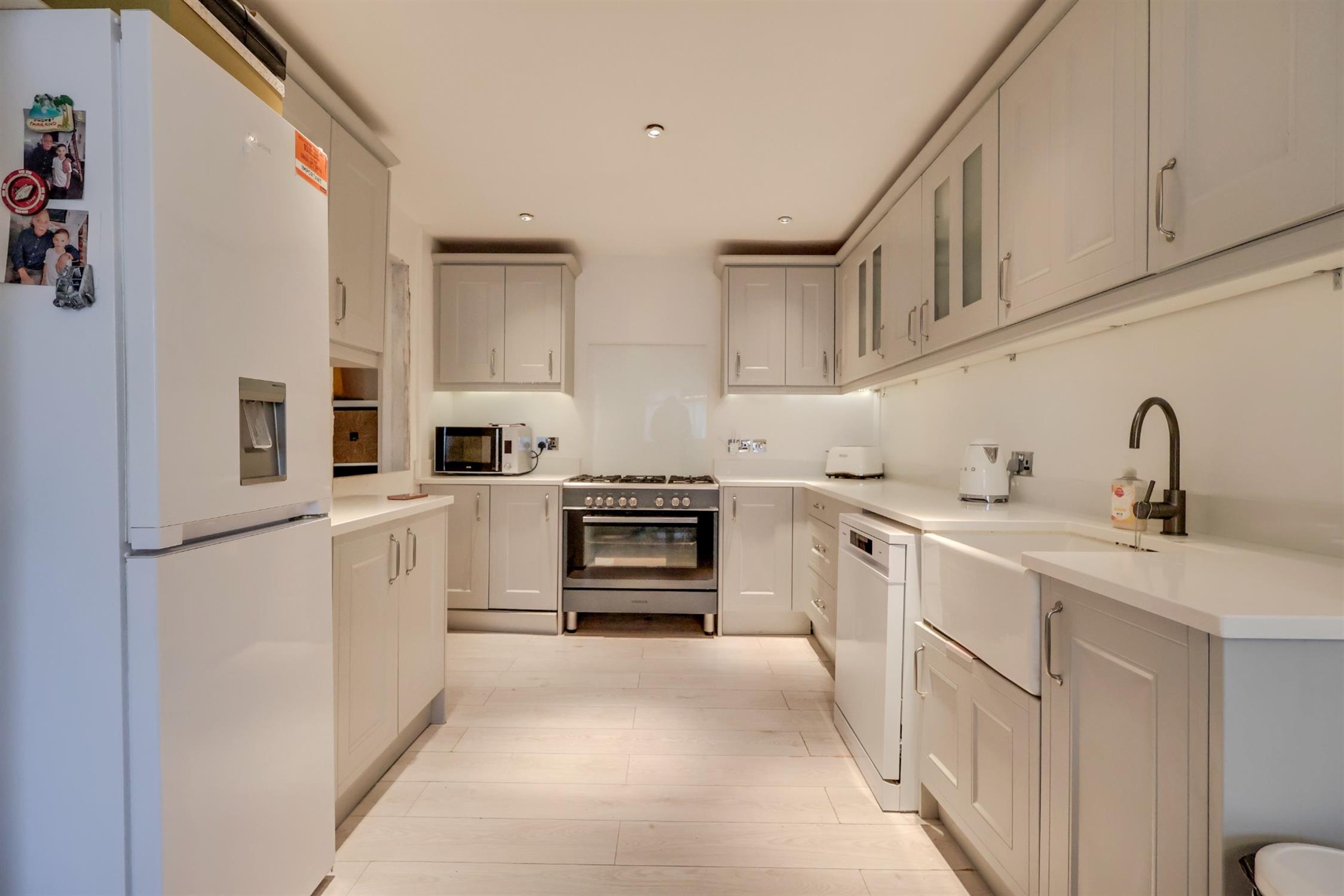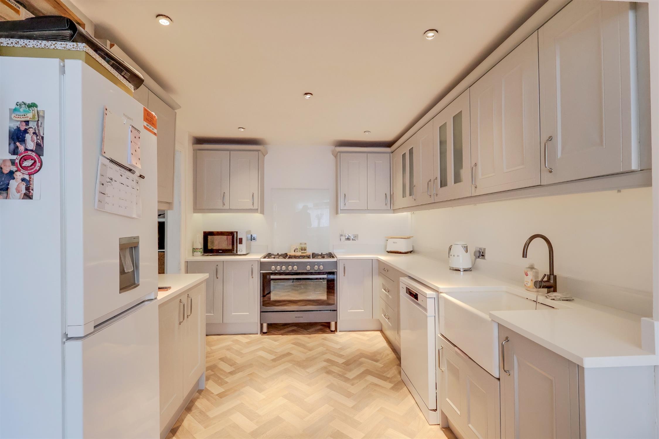 Smooth finish to ceiling with inset spotlights, double glazed window to side elevation, range of matching shaker style wall base and drawer units with Quartz work surface over, Butler sink, space for Range cooker, fridge/freezer and dishwasher, feature wall panelling, radiator.