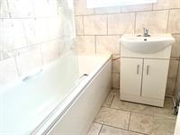 White suite with bath with shower over, sink with vanity cupboard beneath and window to rear.