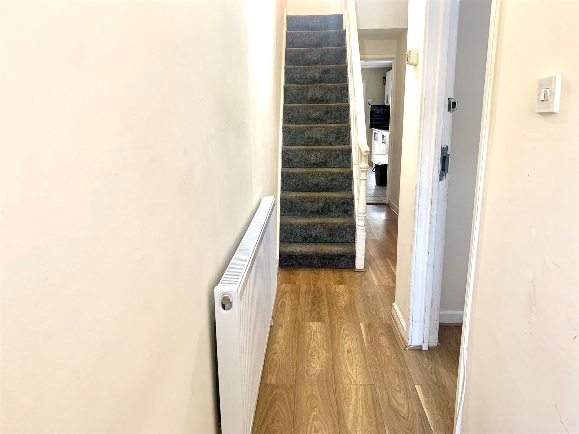 Laminate flooring with stairs to the first floor, a cupboard under stairs and doors to the lounge, dining room and kitchen.