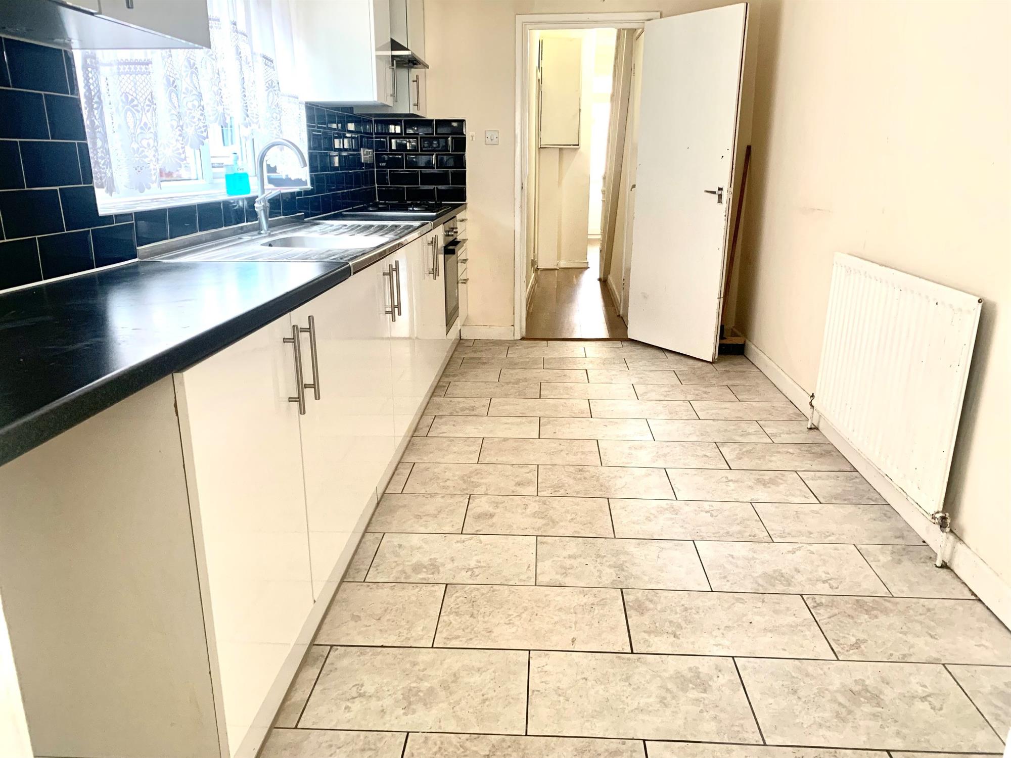 White gloss wall and base units with appliances consisting of a gas hob and electric oven. Space for a washing machine and fridge, although these will not be supplied. Plenty of space for a table and chairs and a window to the side. There is also a door to the inner lobby.
