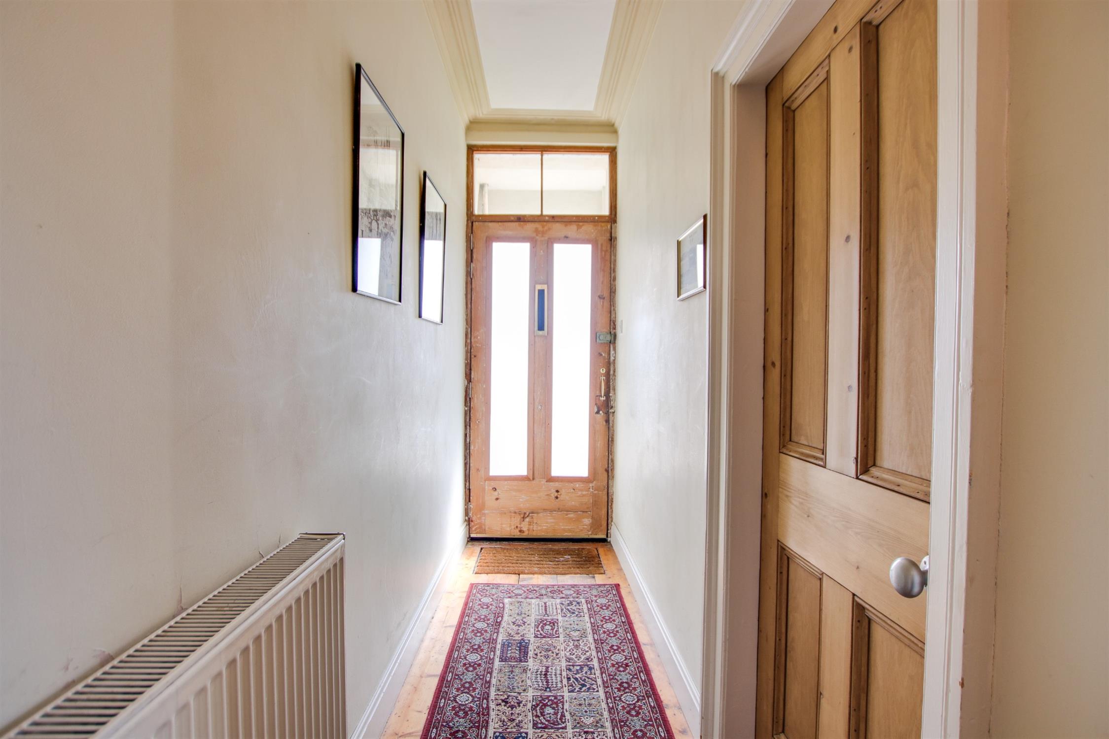 Smooth finish to ceiling, original coving, full height front door, solid wood flooring, radiator, stairs rising to first floor with storage space under, steps leading down to breakfast room, solid wood doors leading to:
