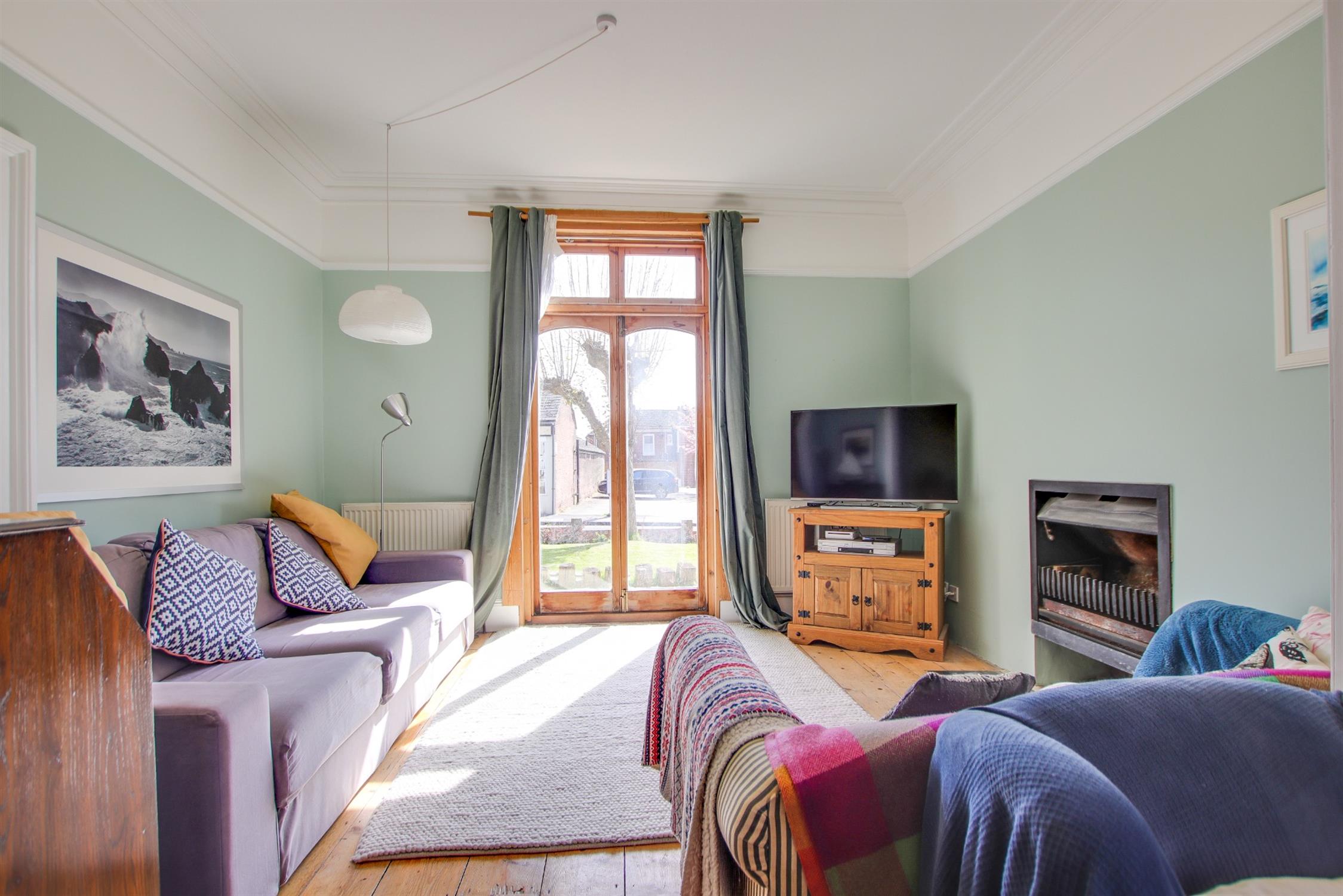 Smooth finish to ceiling, original coving, original picture rails, double glazed arch French windows to front aspect, open fireplace with log store and exposed brick wall feature, two radiators, solid wood flooring, open to: