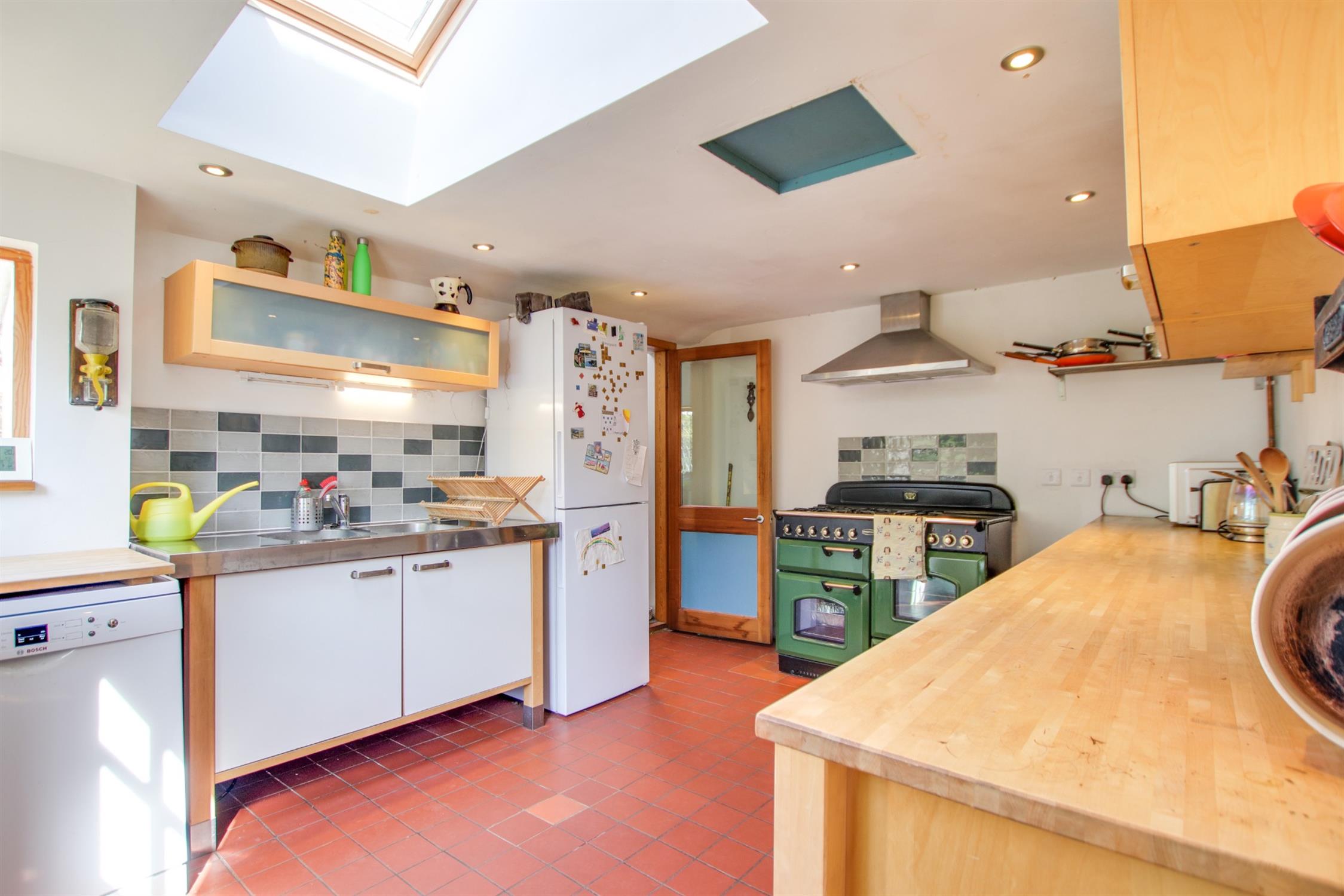 Smooth finish to ceiling, inset spotlights, skylight window, double glazed corner window to side and rear aspect, feature door to side aspect opening to garden, range of bespoke, free-standing wall and base drawer units with solid wood work surface over, stainless steel double bowl sink and drainer inset, space for fridge freezer, dishwasher and tumble dryer, Classic 10 Rangemaster cooker with two ovens, grill and five burner gas hob, vertical panel radiator, tiled flooring, door leading to: