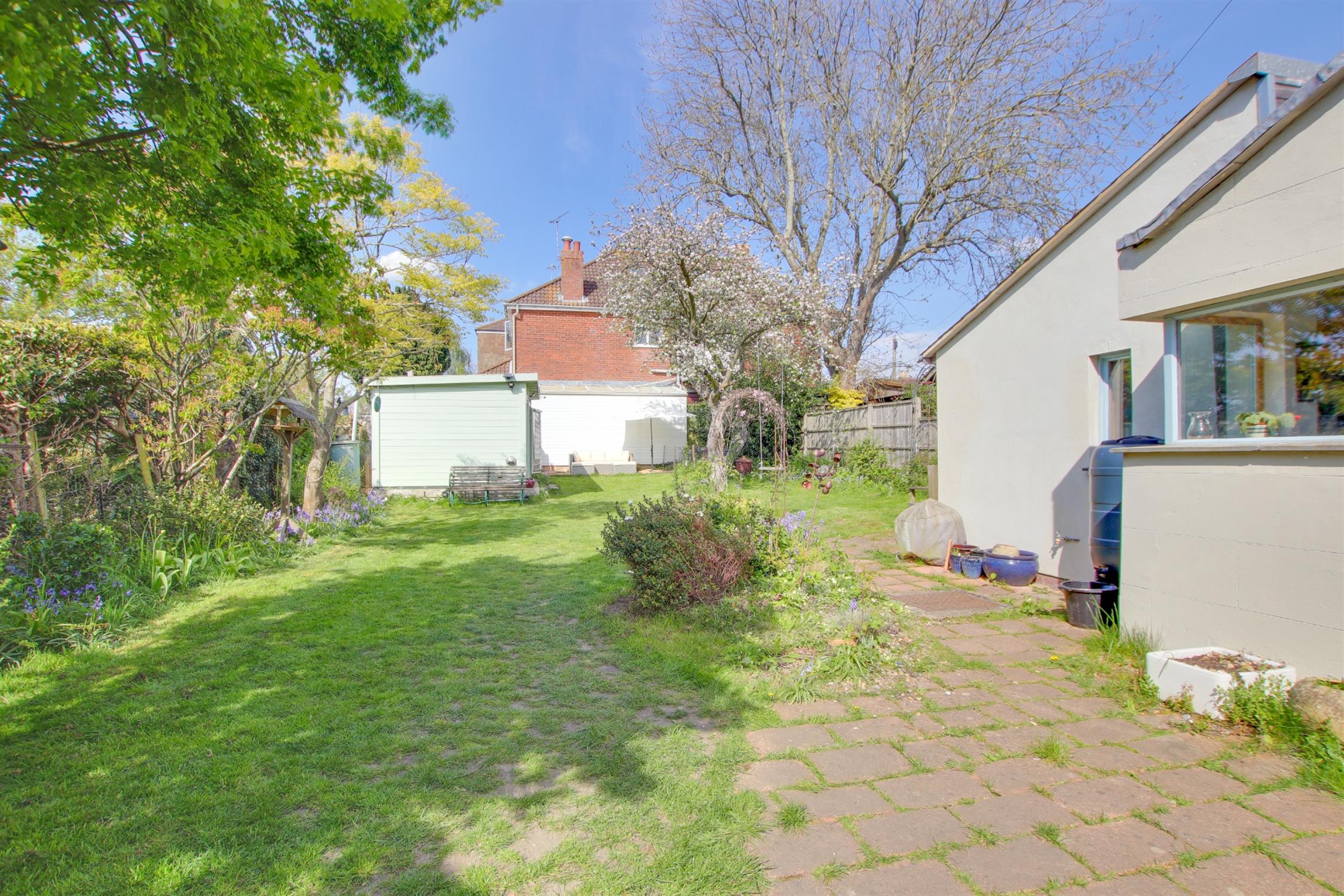 Fence enclosed rear garden offering a good degree of privacy, predominately laid to lawn with a selection of mature flower and shrub borders, two apple trees, seating area, side pedestrian access, access to: